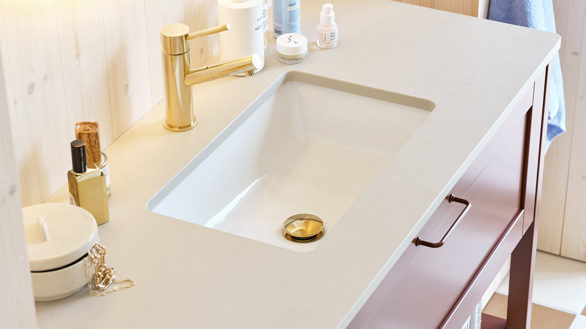 När Anno hittar in i badrummet är möbelkänslan stark och förvaringsutrymmena generösa. I år har vi uppdaterat Anno både på insidan och utsidan. Här visar vi Anno i ny bredd, med luckan Edit och nya lådor med ny inredning. I vår nya jordröda kulör, handtag ton i ton tillsammans med vitpigmenterade furuväggar och rutigt golv är Anno verkligen i sitt rätta element. Möblernas mjuka former återkommer i den runda spegeln med fint dekorljus. Tidlöst för vår tid.