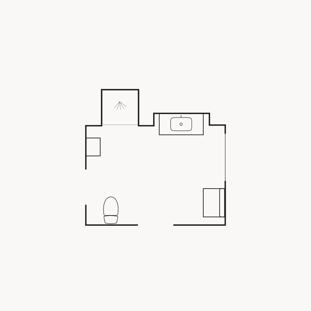 Ett tidlöst badrum med naturligt varma kulörer och generös förvaring.