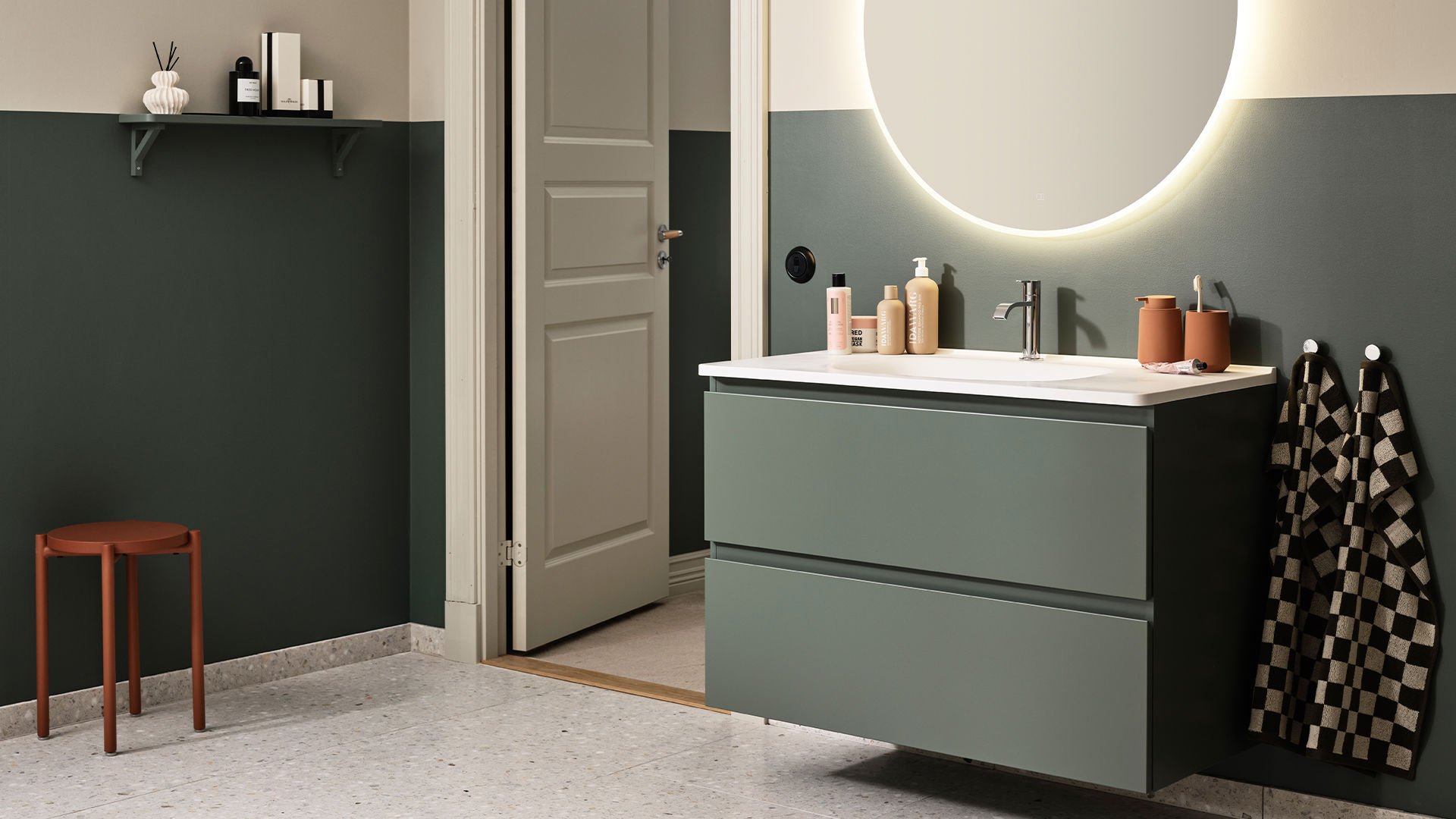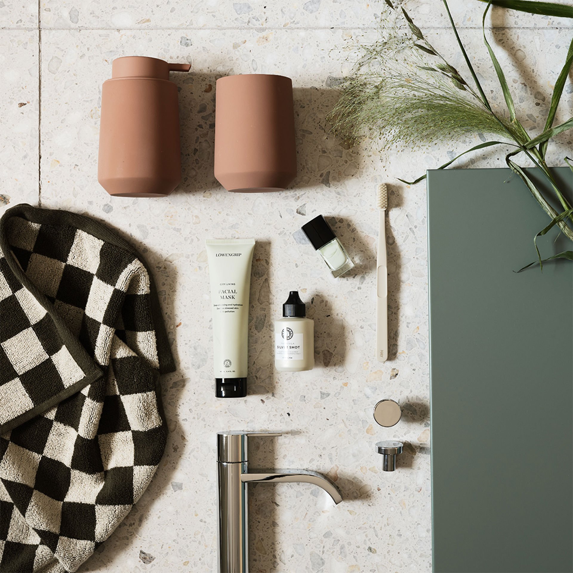Ett rymligt badrum som ligger i anslutning till sovrum och dressingroom. Det har en genomgående färgsättning i naturnära skogsgrönt och linnebeige, tillsammans med ett ljust terrazzogolv. De stilrena linjerna har vi mjukat upp med en rund spegel och det taktila tvättstället Flow i Top Solid. Avställningsytor både på hylla och tvättställ och massor av förvaring i kommoden.