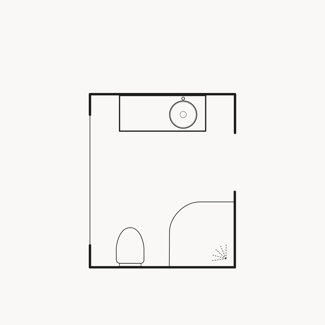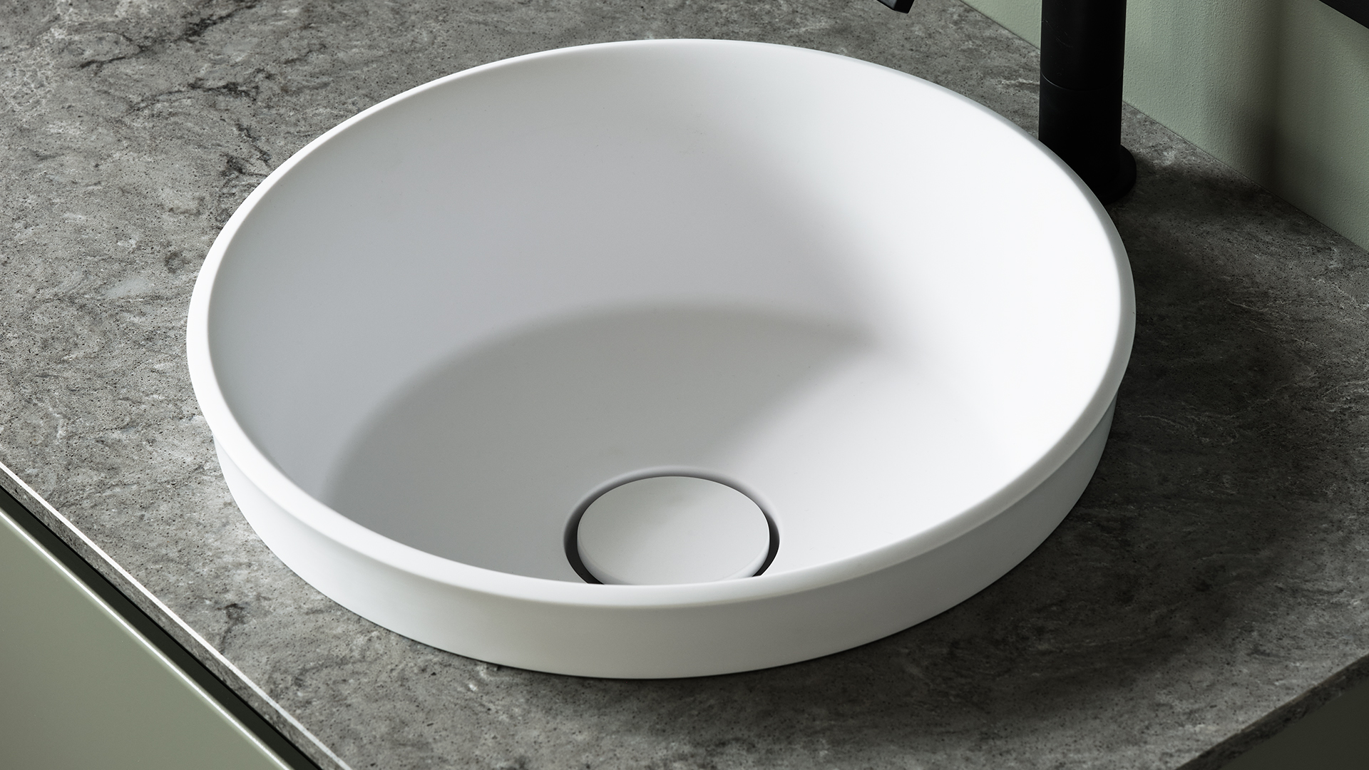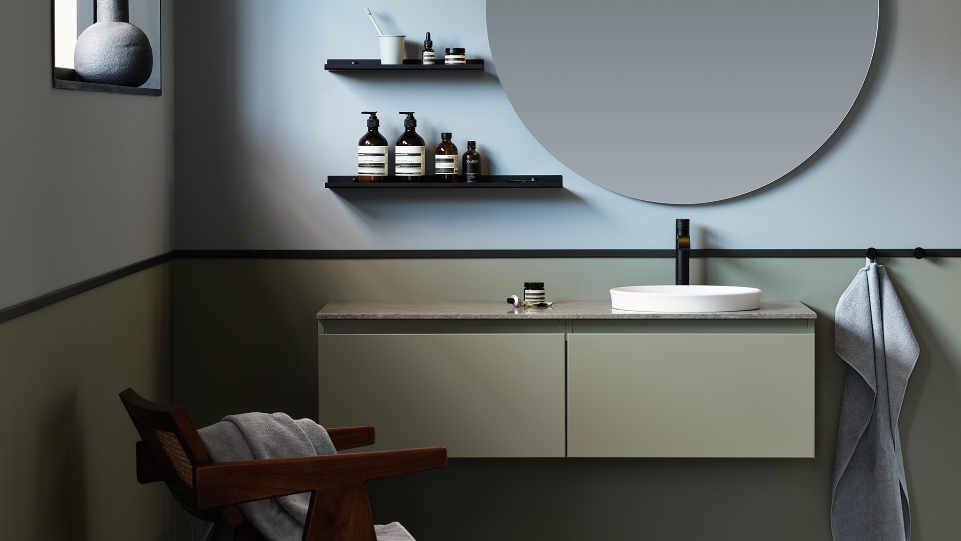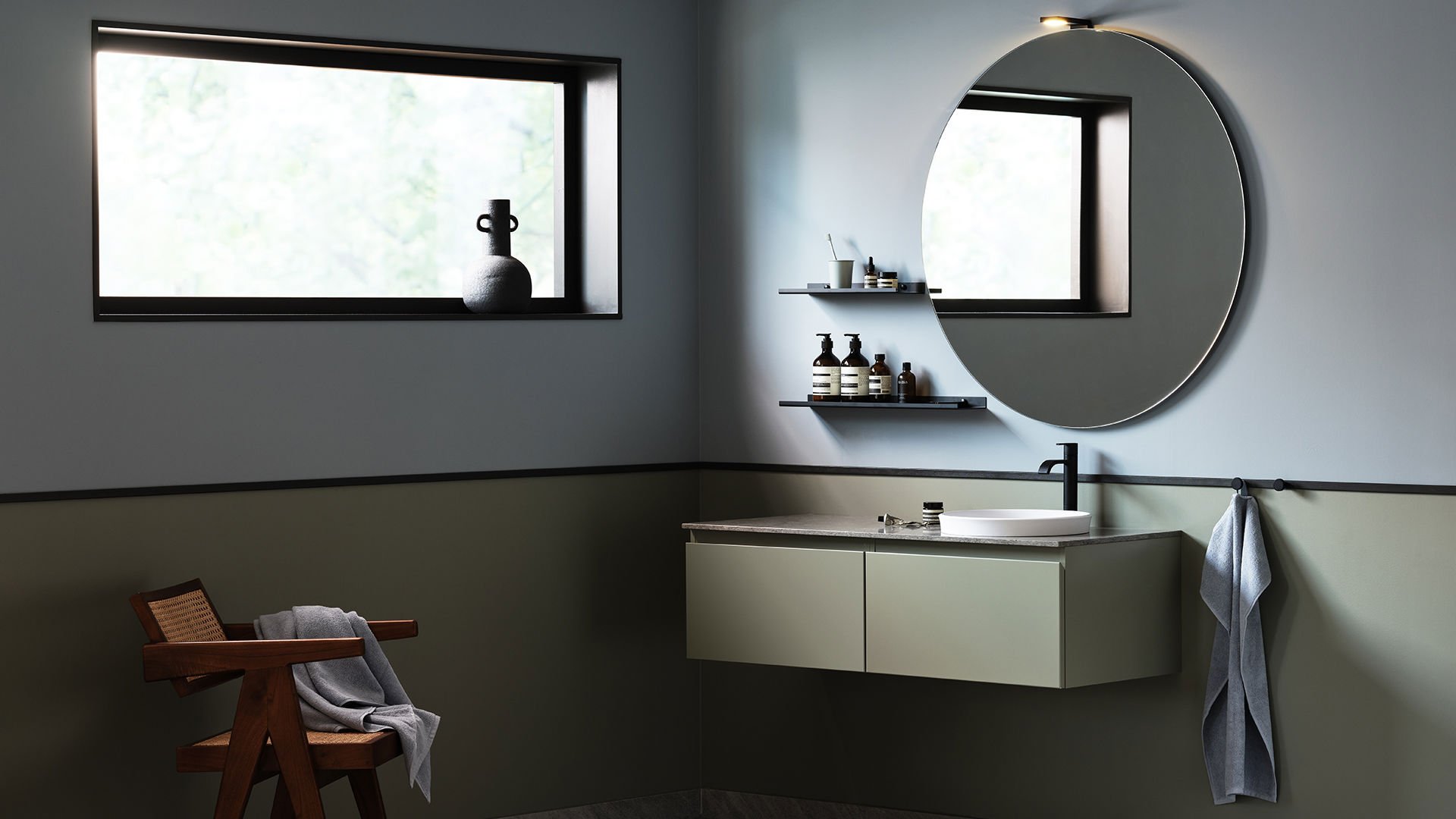 Ett ljust och luftigt badrum med en färgkombination där himmelsblått möter grönska. Den taktila topplattan i kompositstenen Turbine Grey passar fint till det seminedfällda tvättstället Zone. Här får du generösa avställningsytor vid handfatet, en stor rund spegel för att skapa extra rymd och luftighet i badrummet – och hyllor i svart metall som ger badrummet karaktär.