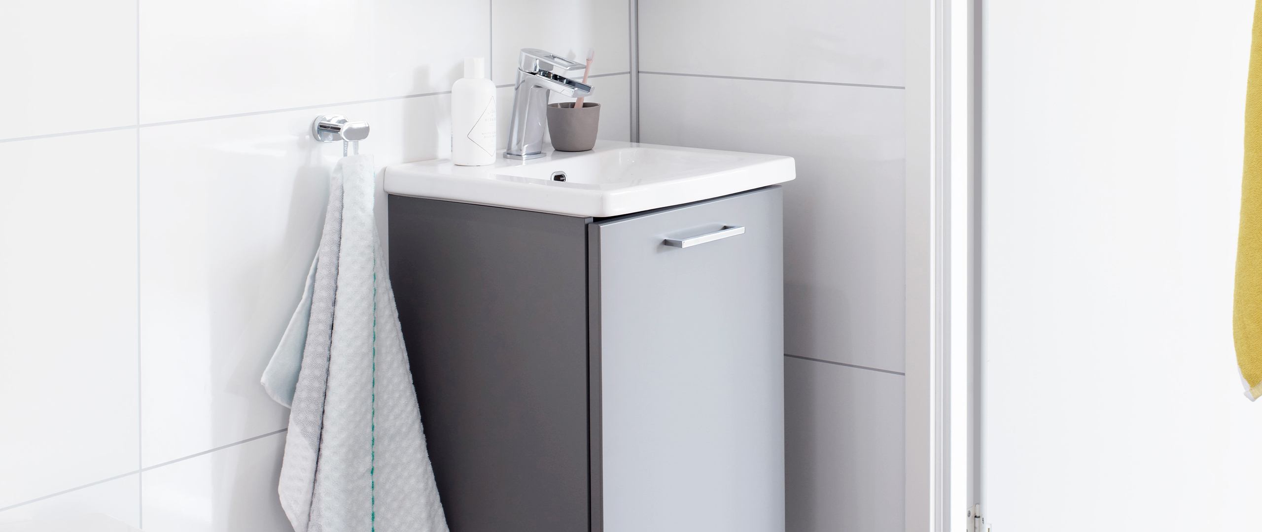 I det här badrummet har vi valt en Flow i bredden 600 mm i ett grundare utförande, utan att seriens rena linjer går förlorade. Den rosa tonen på väggarna och det gröna kaklet i duschen är en pigg kontrast till golvets stenuttryck och den vitpigmenterade ekens obehandlade träkänsla.