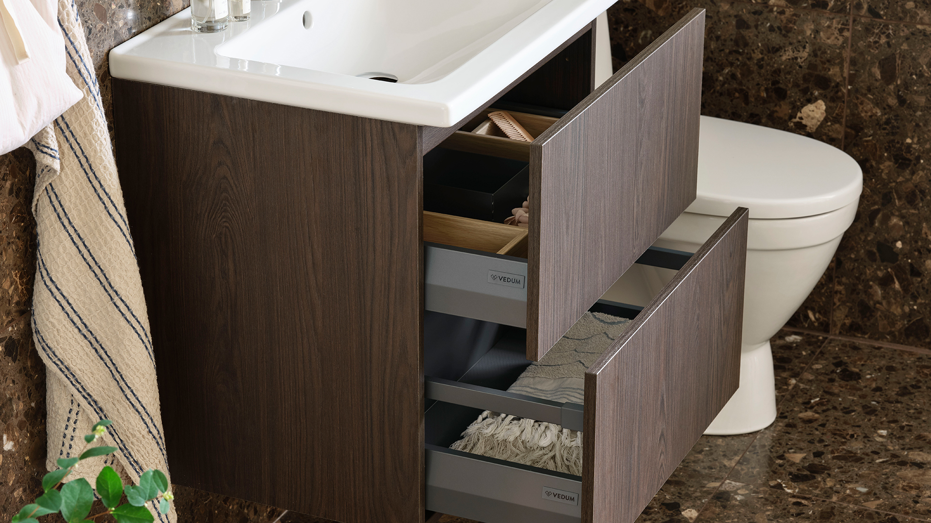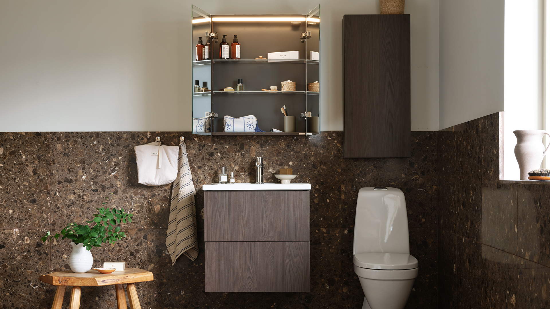Den nya Svanenmärkta melaminluckan Ilse brun ek ger badrummet en ombonad och naturligt varm känsla. Här i kombination med badrumsmöbeln Free och vårt nya spegelskåp Ätran med smidig integrerad belysning. Överskåpet är placerat ovanför toaletten för att använda utrymmet på bästa sätt – en praktisk lösning i vardagen.