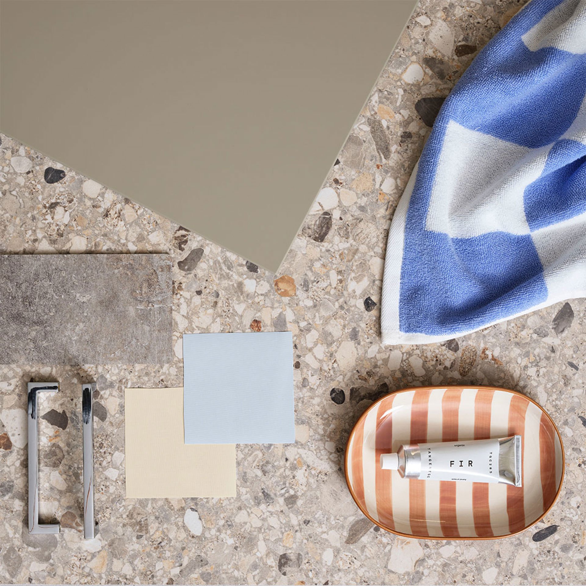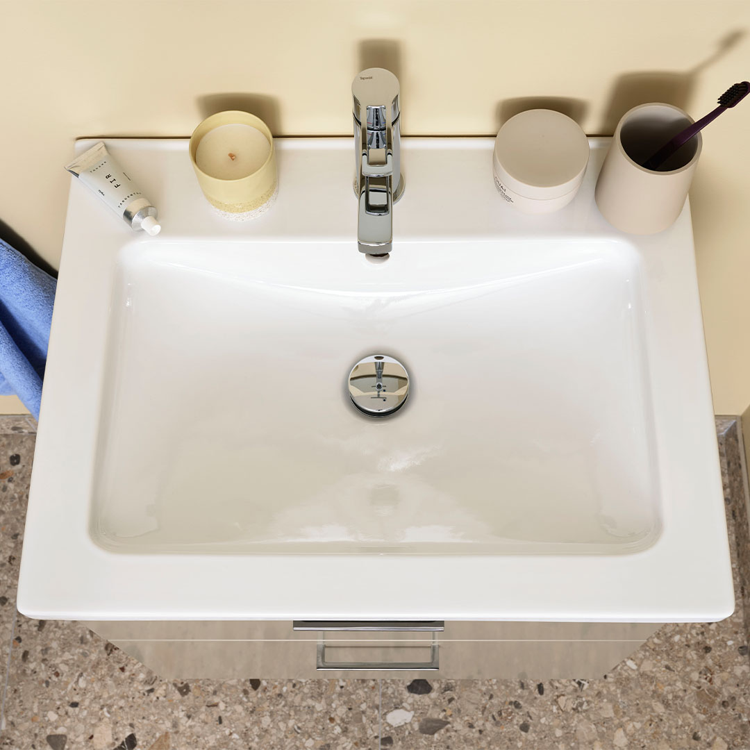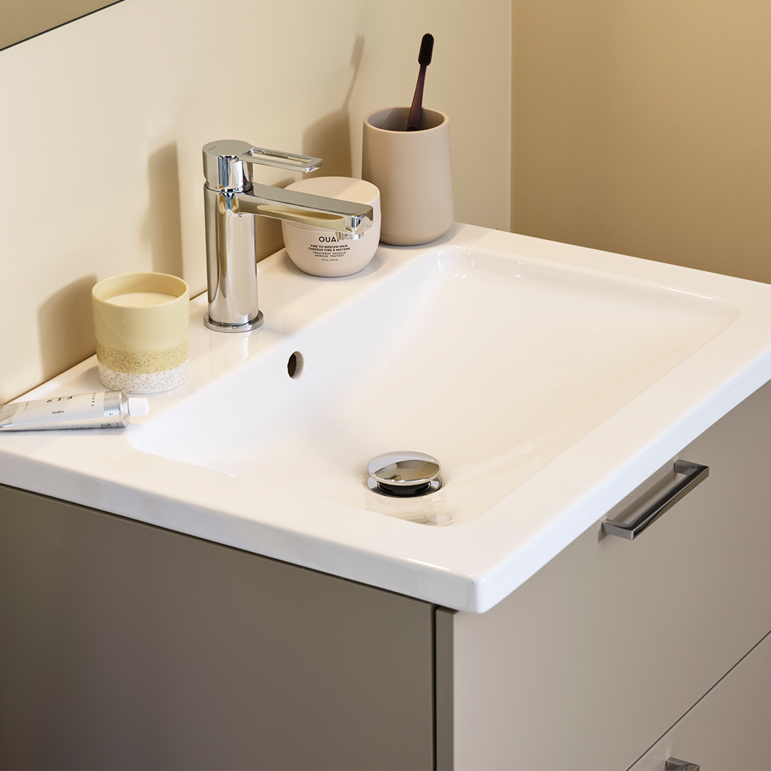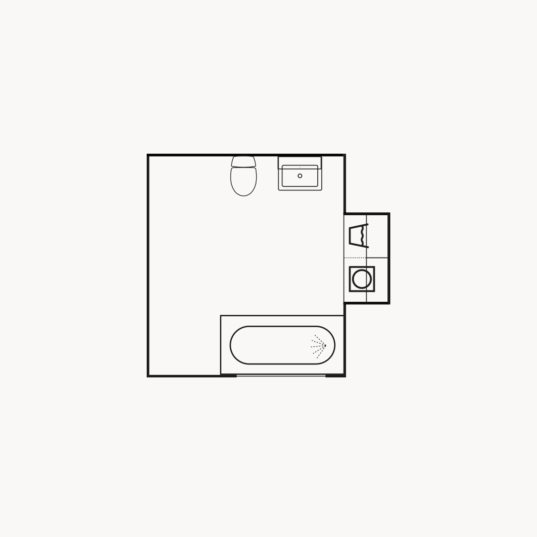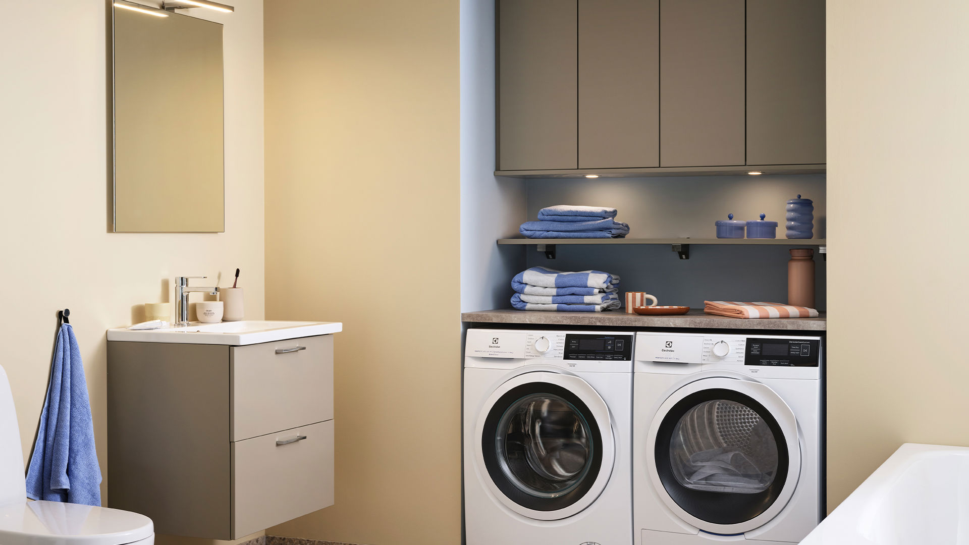 Solgula väggar, ljusblå nisch och Terazzogolv skapar en somrig känsla att njuta av året om – och luckan Maja i sandbeige binder samman allt i en ljus och lugn helhet. Här finns också plats för en praktisk tvätthörna, utan att vi har kompromissat med badrummets öppna och vilsamma uttryck.