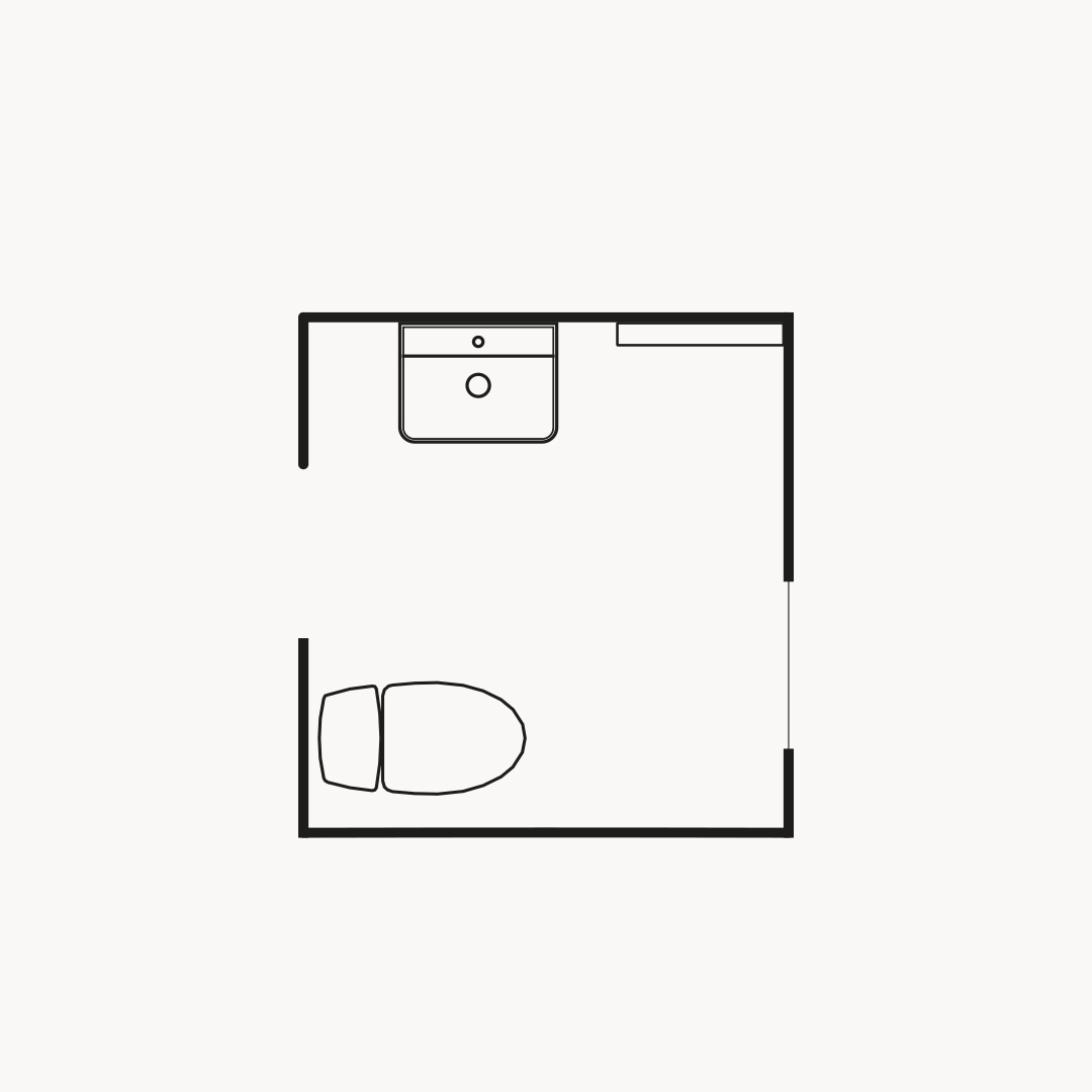 I det här lilla badrummet använder vi Frame som är en inramning av kommoden för att skapa en distinkt, arbetad möbelkänsla. Miljön med den fyrkantiga spegeln Billan drar åt det grafiska, men med en mjuk, balanserad och naturlig ton. Öppen förvaring på vägghyllor för sådant du behöver ha lättillgängligt och dold förvaring i kommoden. Enkelt, stilrent och välkomnande.