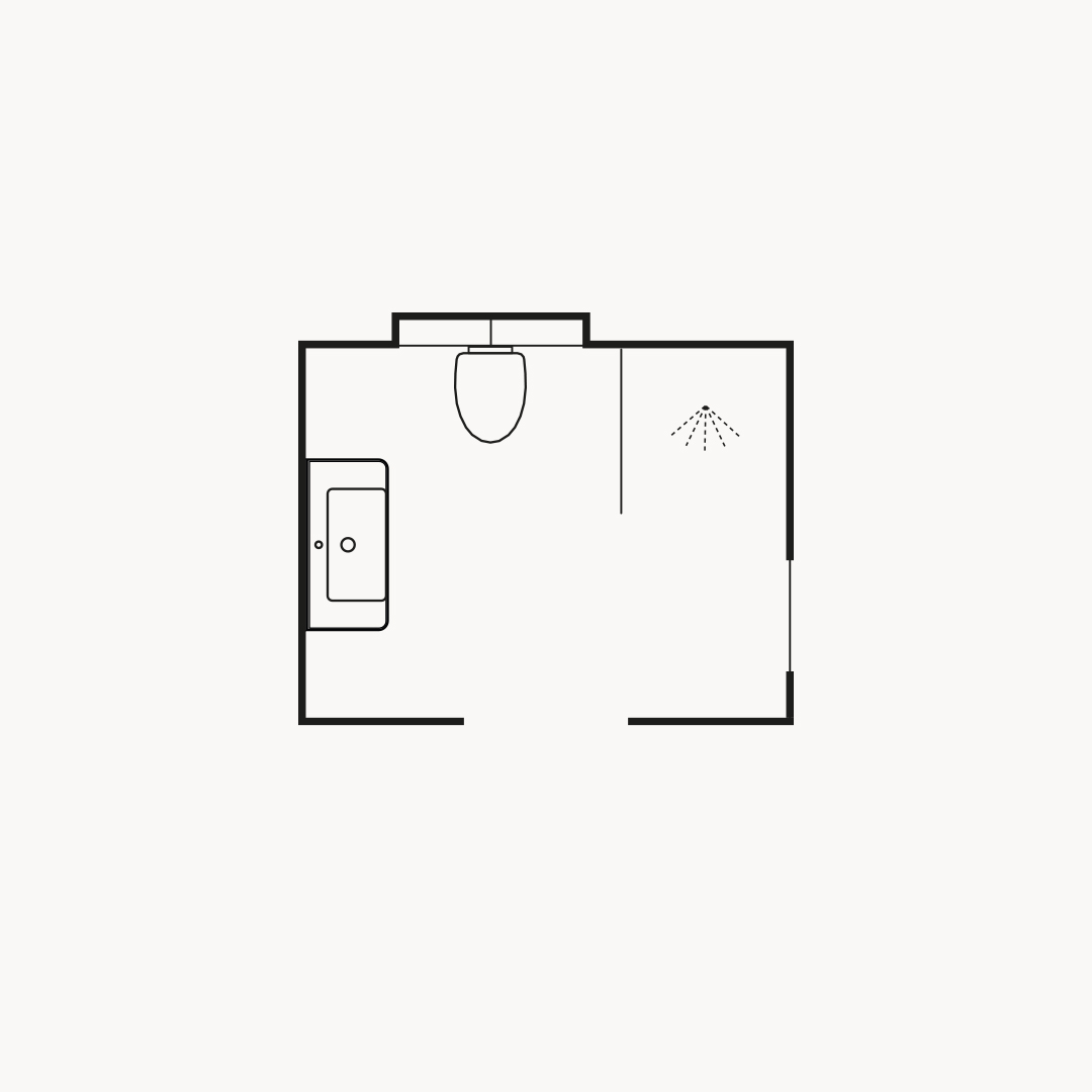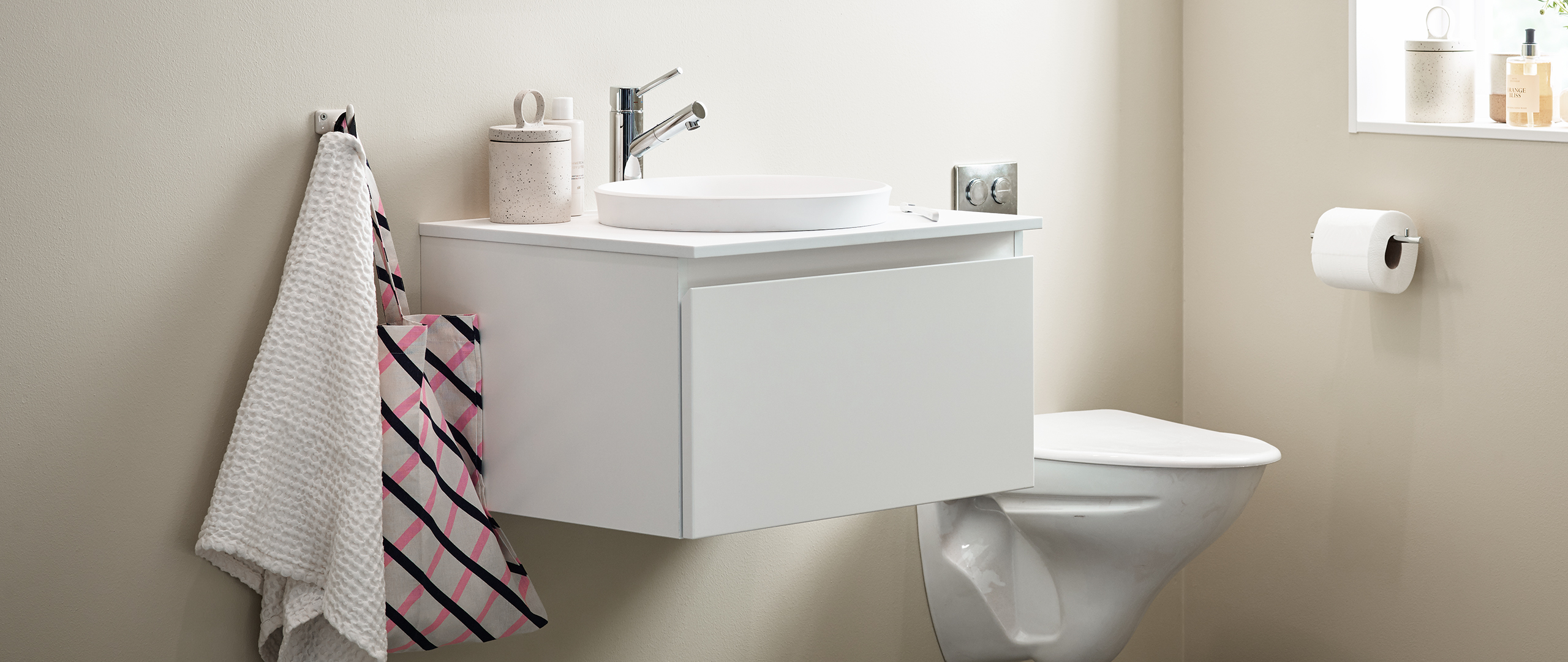 Ett badrum i turkosgröna toner där den smala ramen och nya kulören mörkgrå på luckan Thea skapar ett sobert uttryck. Den nya spegeln Lövsen med integrerad LED-belysning och svarta detaljer som den nya T-knoppen Tibast förstärker den stilrena känslan.