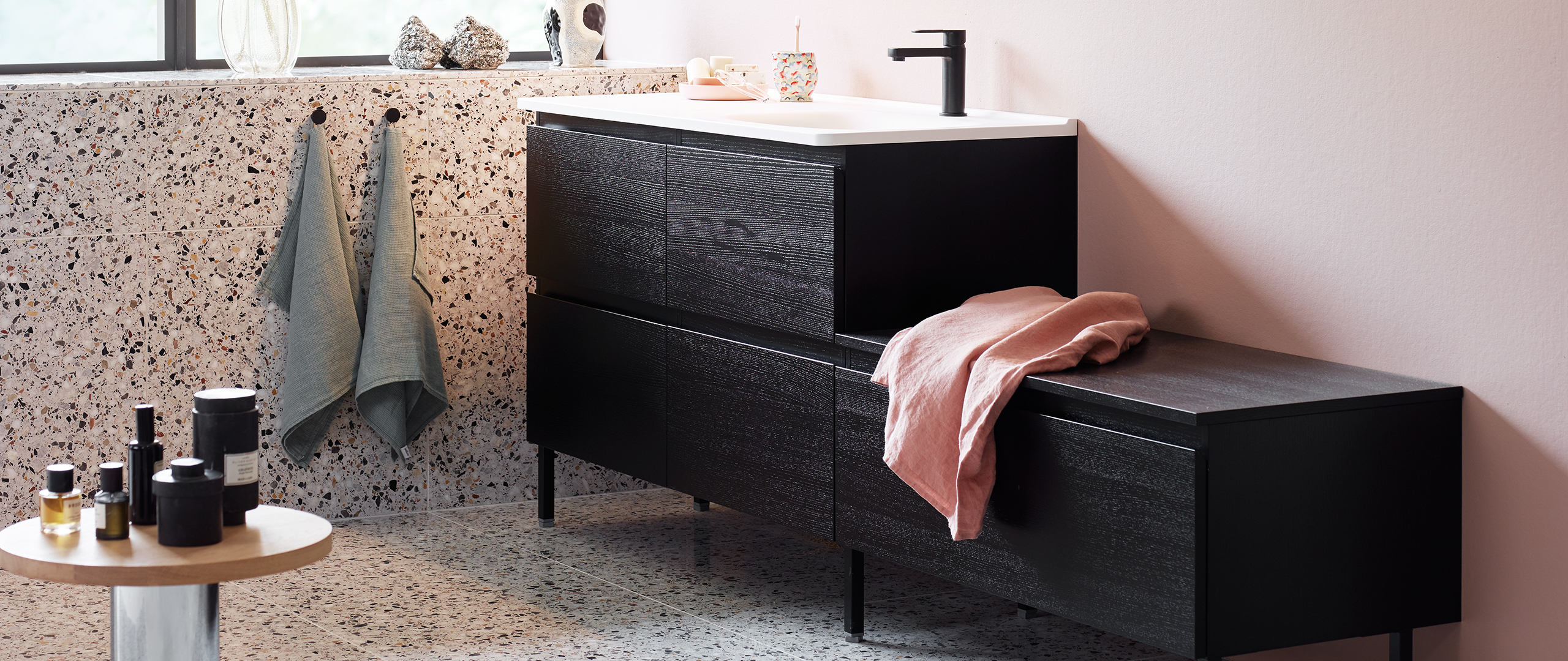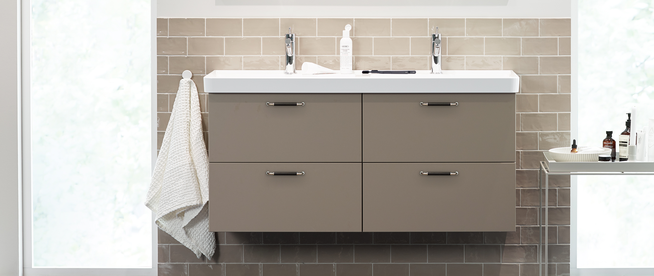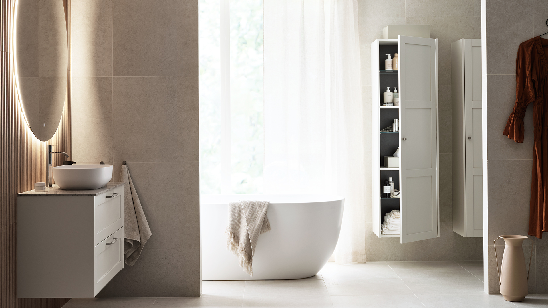Här har vi skapat en luftig miljö som inbjuder till både rörelse och vila för kropp och sinne. Taktila material som topplattan i kompositsten, ljusa naturnära färger och rum i rummet ger en lyxig känsla. Den runda spegeln Mjörn förstärker uttrycket och högskåpen har generösa förvaringsmöjligheter. Den klassiska ramluckan Edit i kombination med Frame gör att badrummet känns tidlöst och samtidigt modernt.