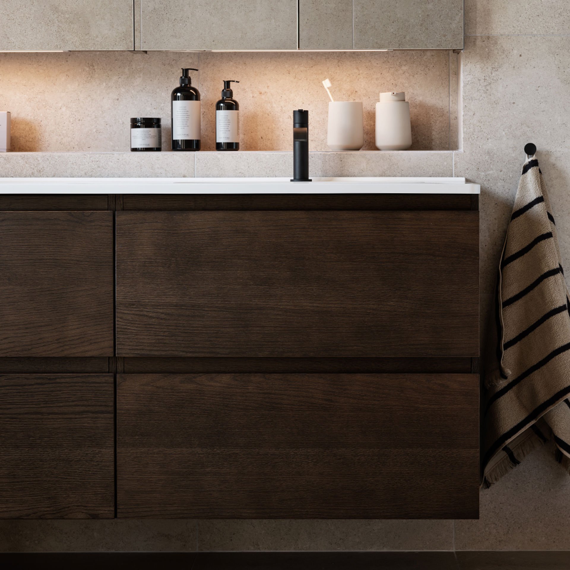 Luckorna i vårt sortiment är tillverkade i MDF-board eller spånskiva. För att få en motståndskraftig yta mot fukt har de en målad, fanerad eller melaminbelagd yta. Tänk på att trä är ett levande material som påverkas av till exempel struktur, ålder och växtplats. Din badrumsinredning kan därför avvika något i färg/fanermönster mot den du sett i butik eller i katalog.