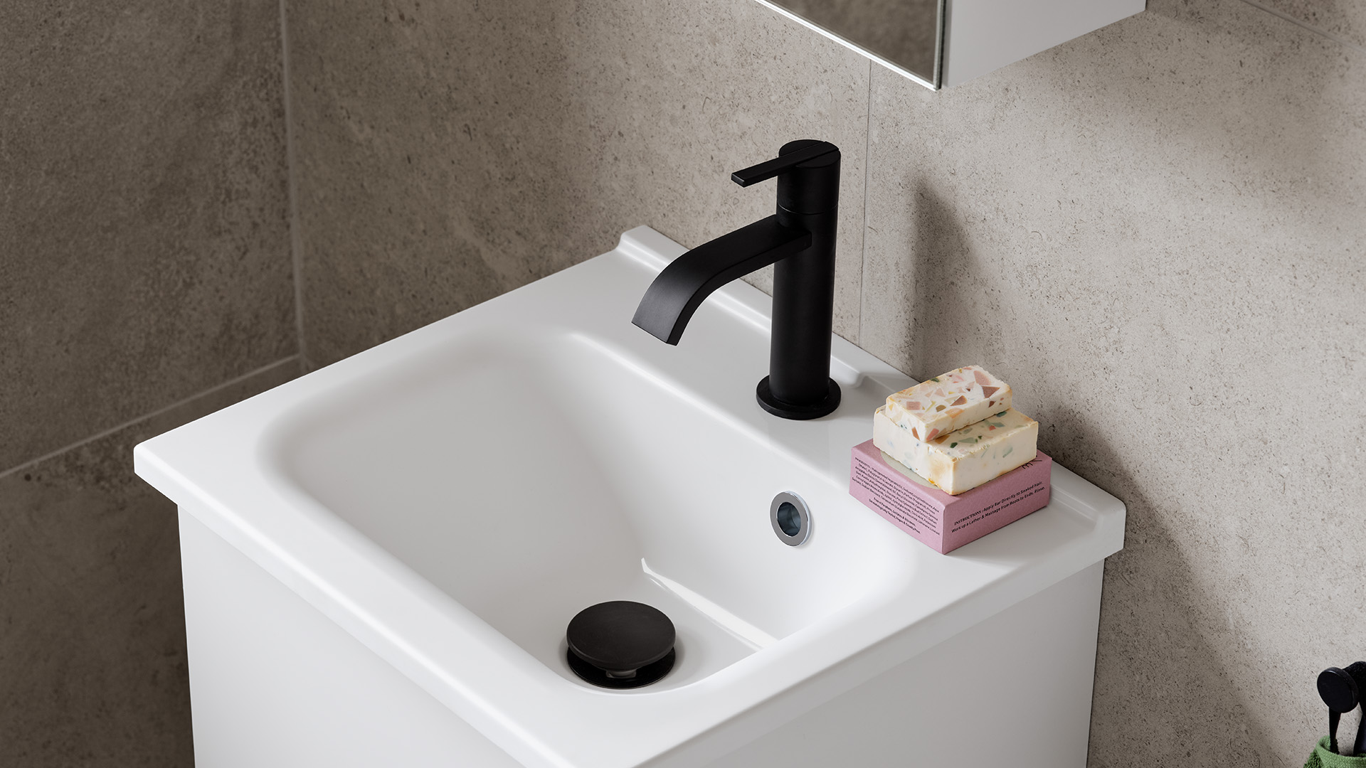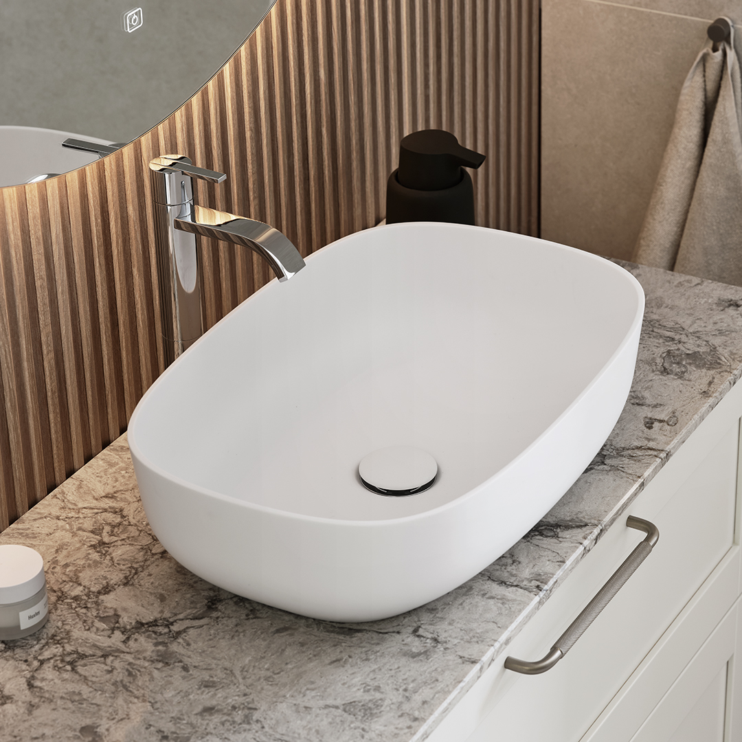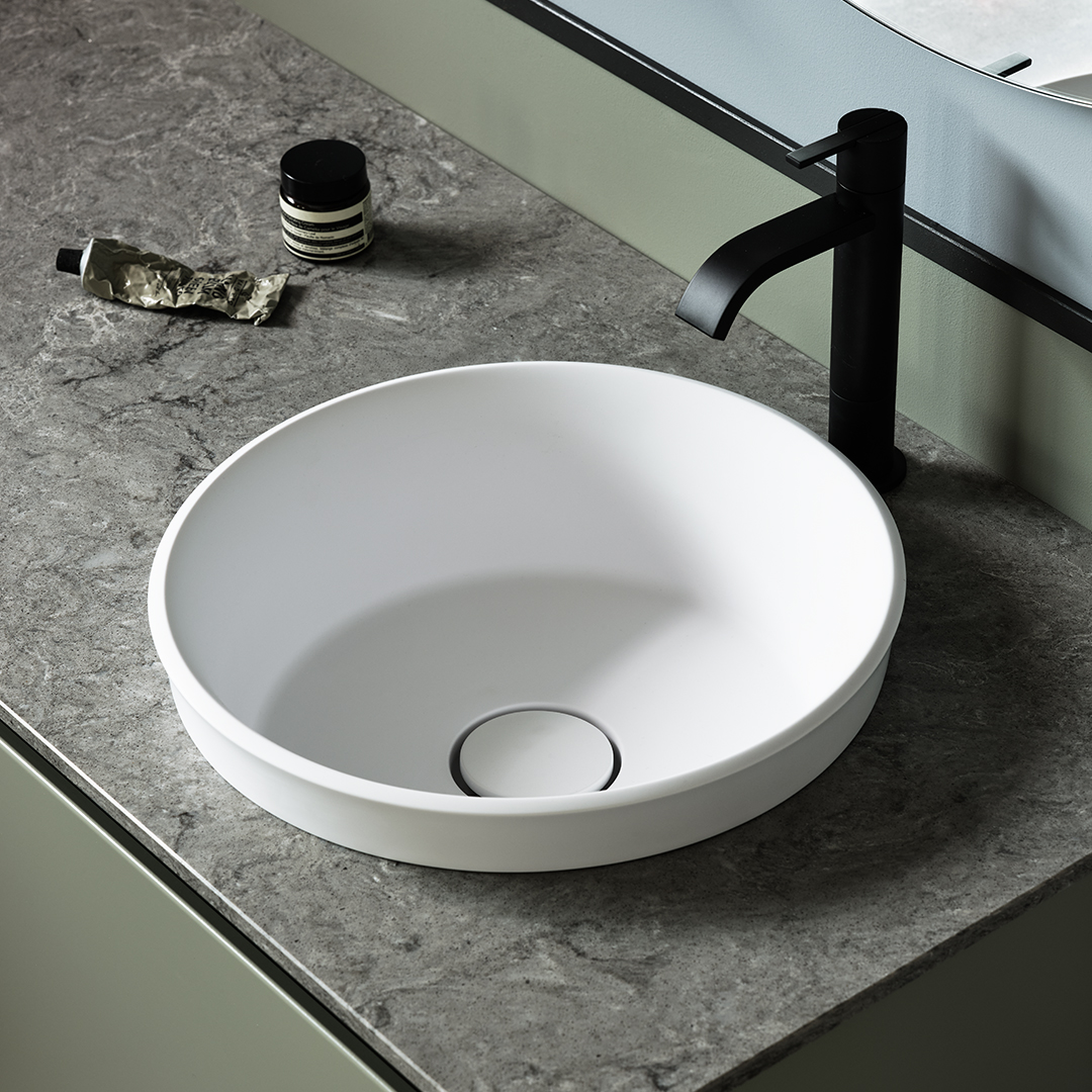 Ett ovanpåliggande tvättställ i den stenliknande, slitstarka och lättskötta materialet Solid Surface. Välj topplatta Solid Surface, kompositstenen Moorland Fog eller kompositstenen Turbine Grey. Passar till serie Mezzo.