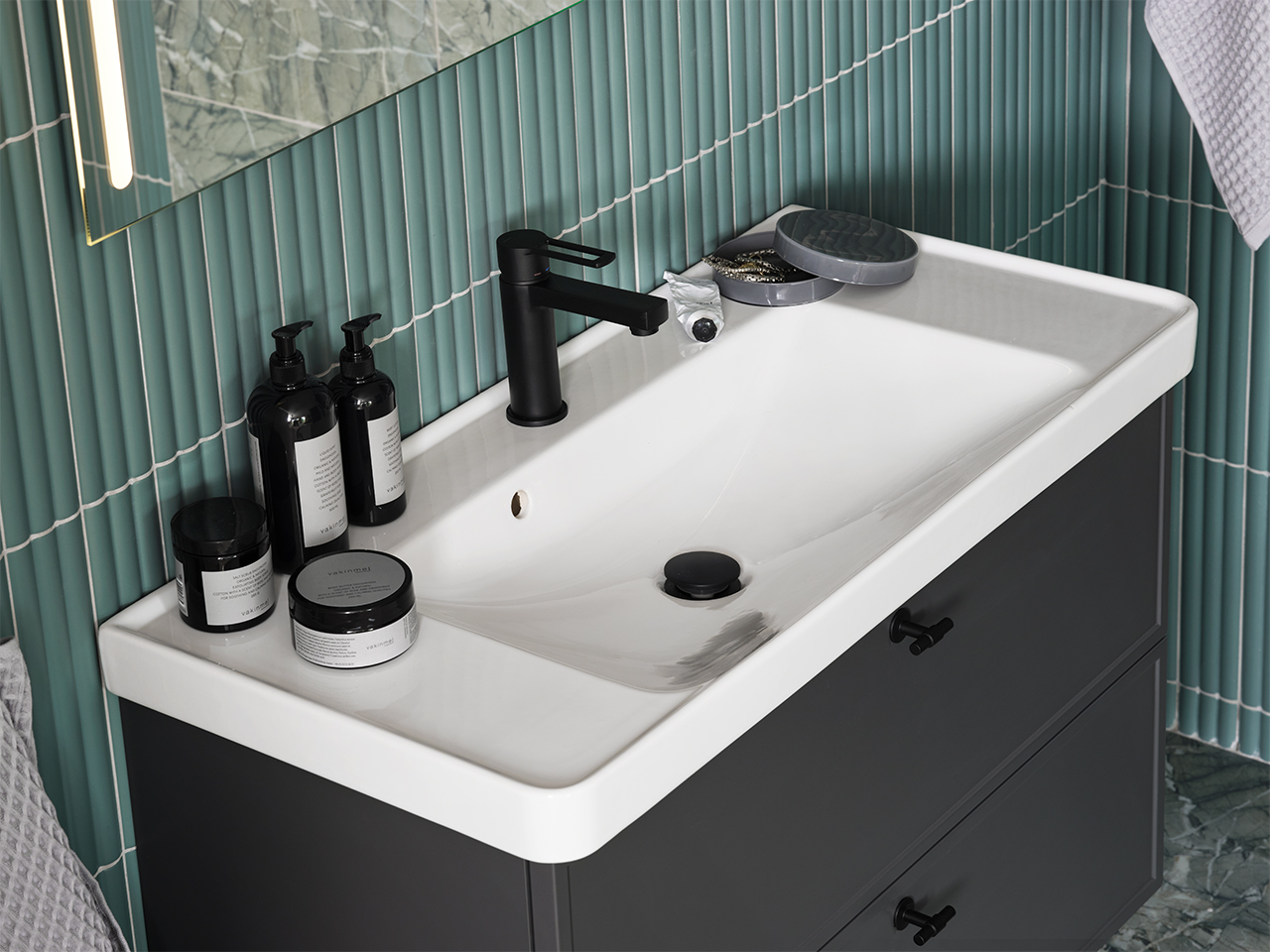 Ett seminedfällt tvättställ i Solid Surface med topplatta i Solid Surface, kompositstenen Moorland Fog eller Turbine Grey. Tvättstället finns i ovalt eller runt utförande. Passar till serie Flow.