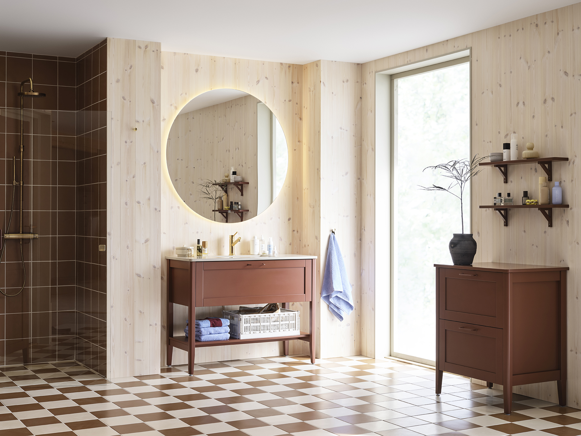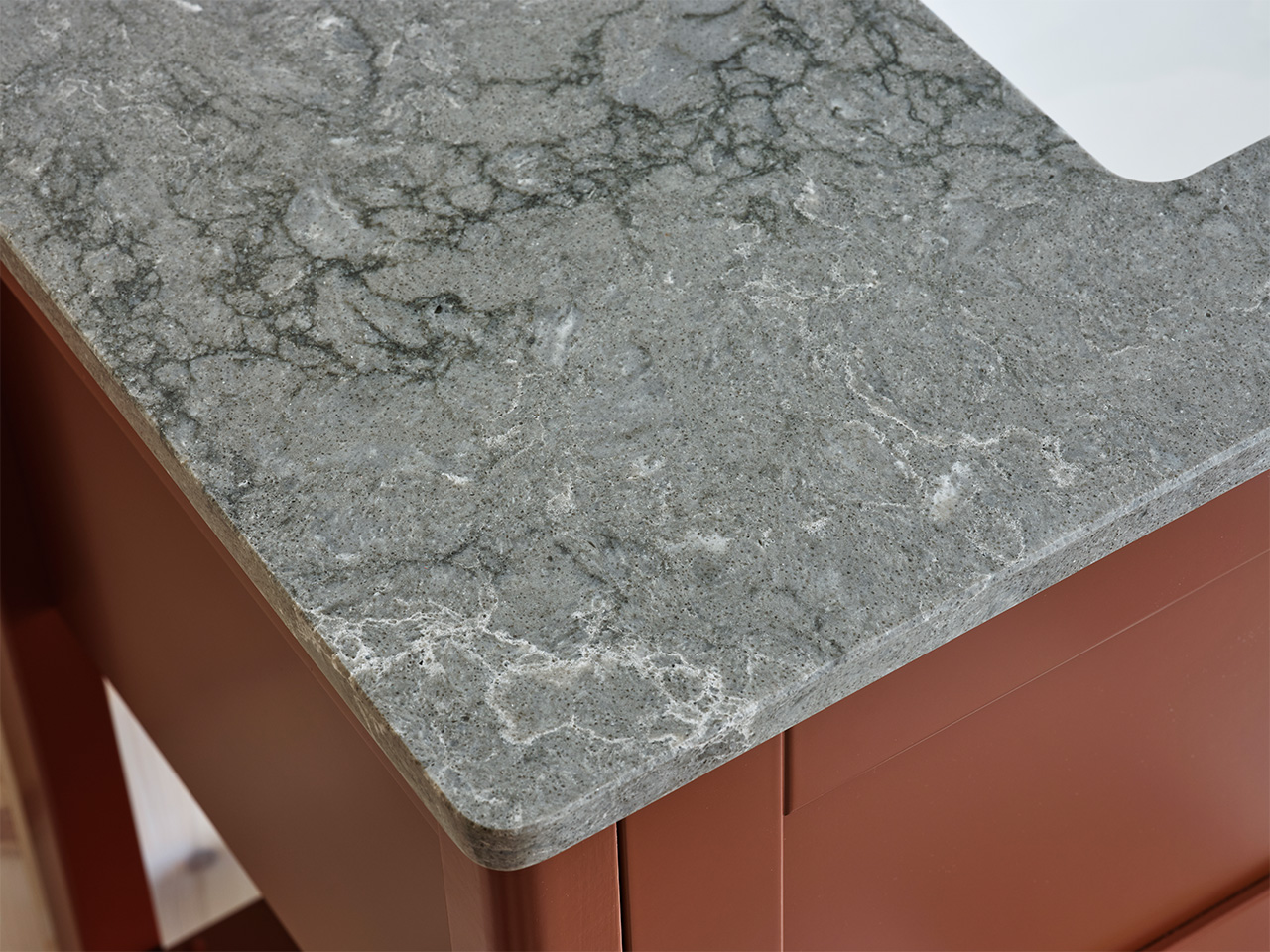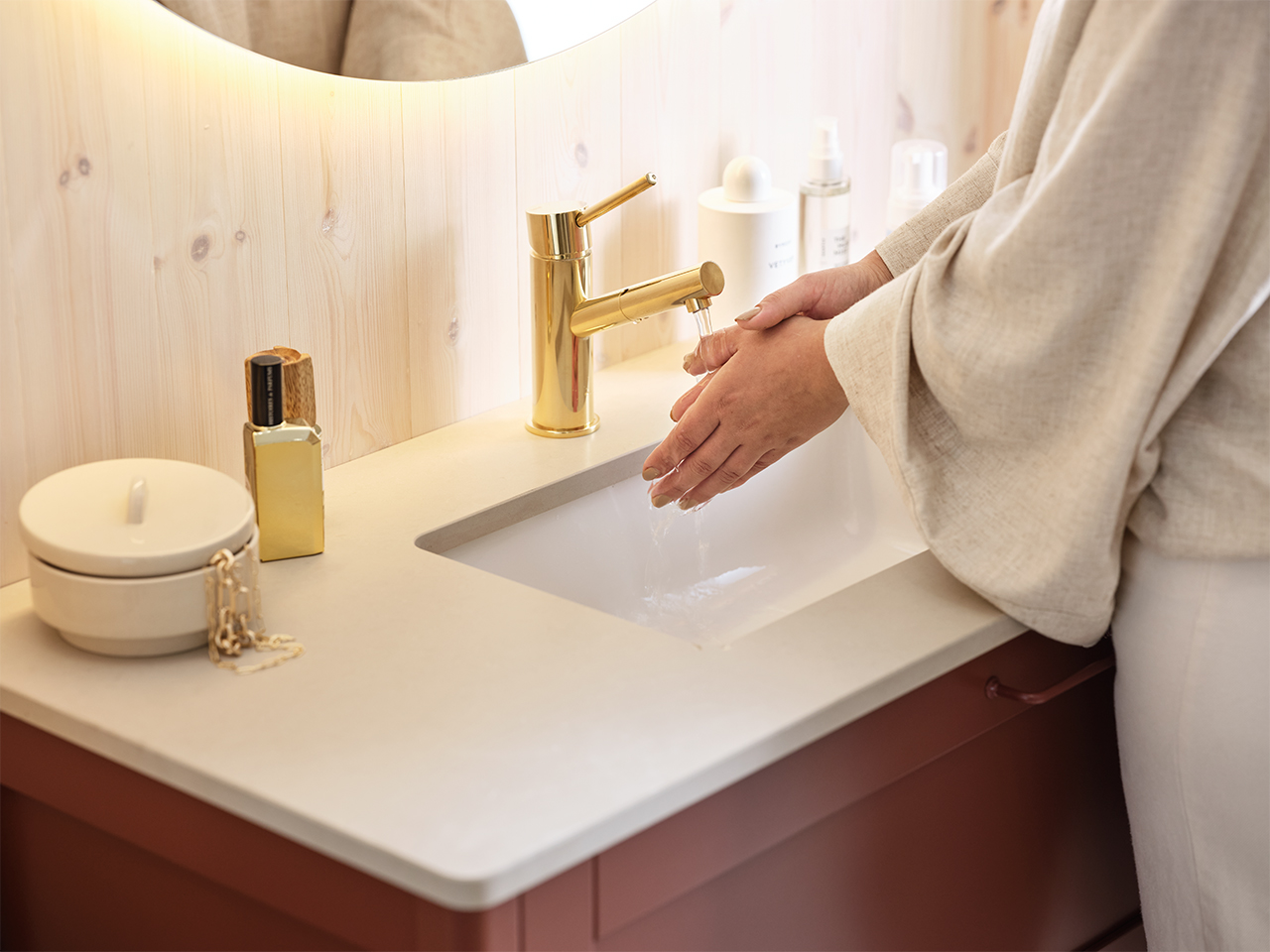 Om bänkskivan har fått fettfläckar av exempelvis smink kan man tvätta av den med en skursvamp utan slippåverkan och diskmedel. Skölj bort allt diskmedel med våt bomullstrasa. Torka torrt med microtrasa. Mineralkomposit liksom granit och marmor, tål hög värme. Dock inte värmechocker. Så en plötslig värmeförändring av t.ex. en varm hårfön eller plattång kan skada ytan. Använd därför alltid underlägg. För mer information läs skötselanvisningen.