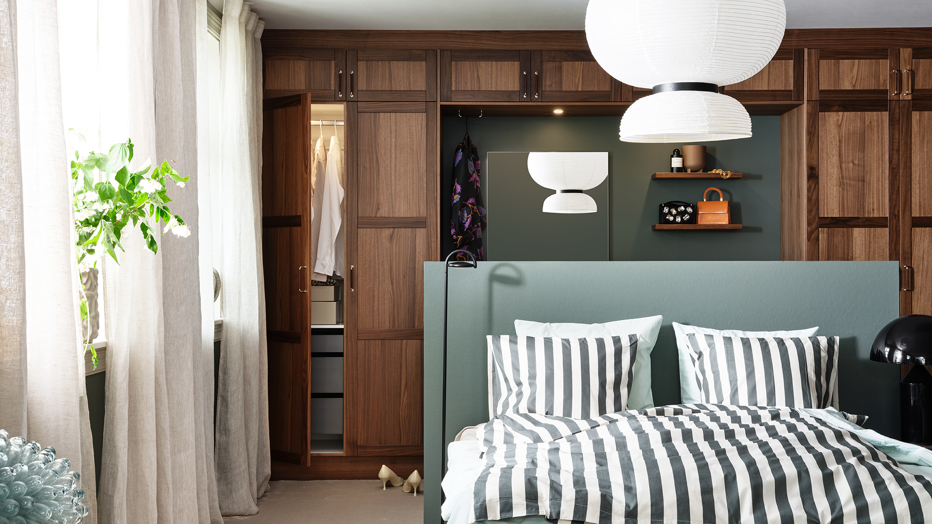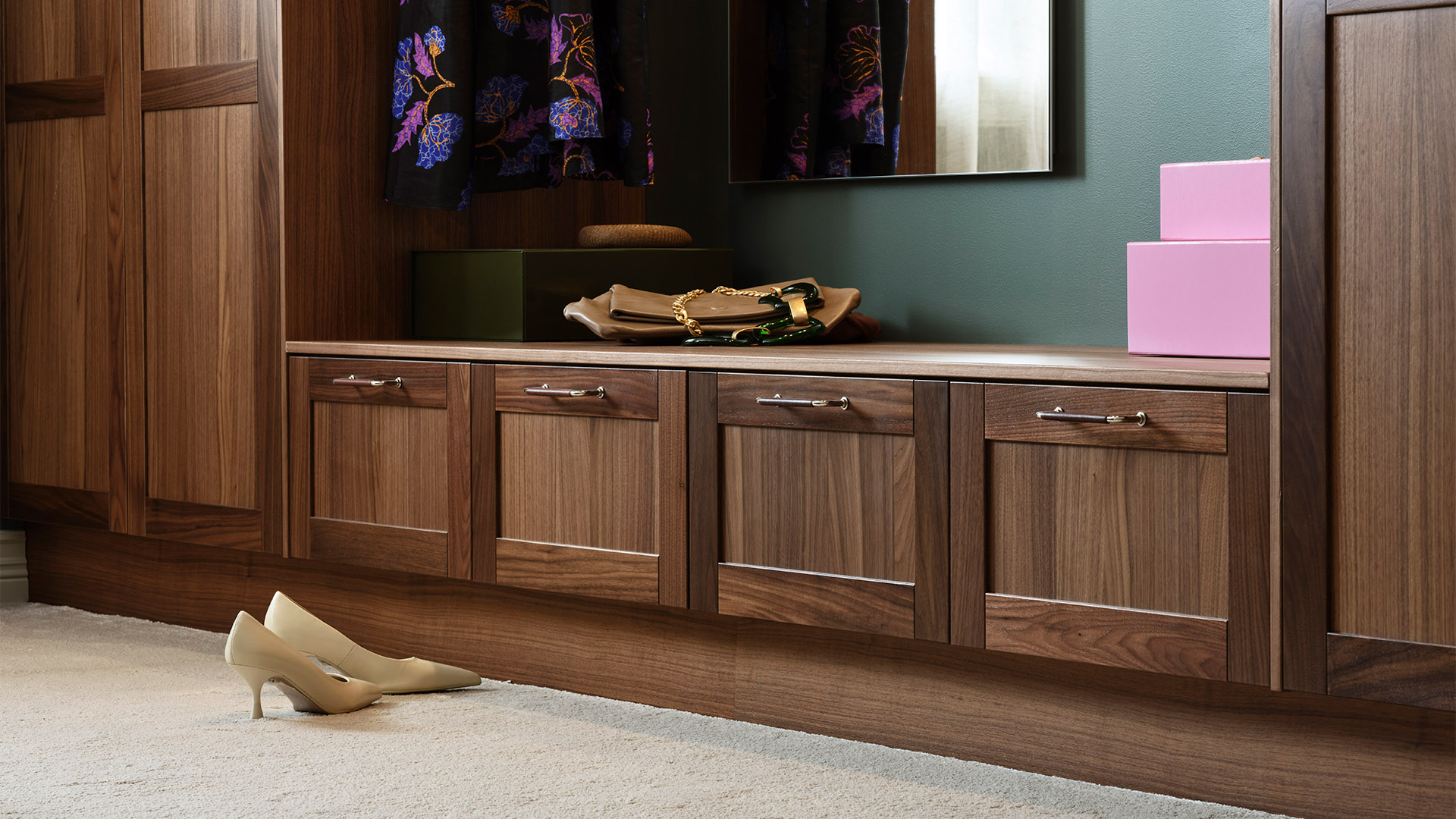 Varmt, ombonat, lyxigt – och ändå funktionellt. Luckan Ester i valnöt används här för att skapa ett dressingroom som är något utöver det vanliga. Massor av förvaring och praktiska lösningar som belysning över spegel, sittbänk och halvhög vägg/huvudgavel som skapar rum-i-rummet utan att störa det öppna intrycket. Hotellkänsla fast ni är hemma.