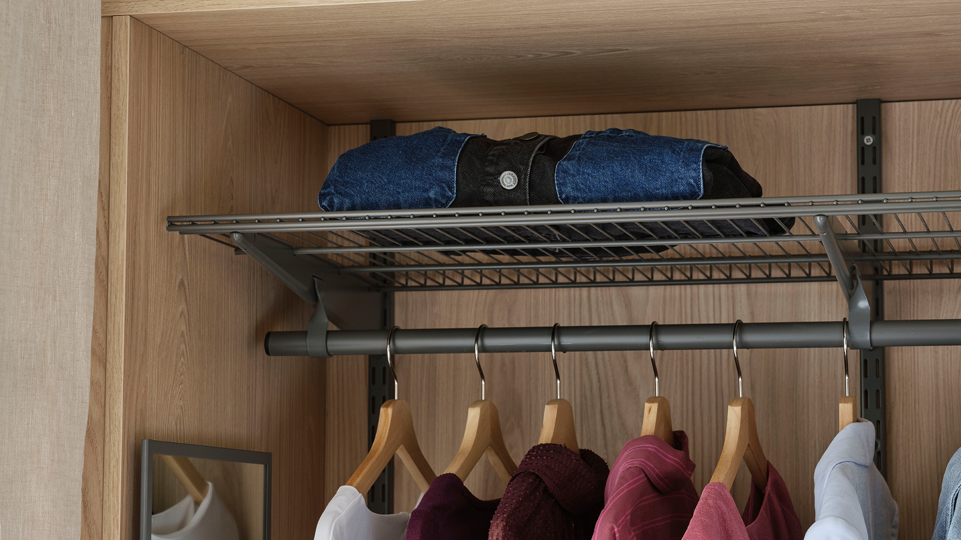 Den nya Svanenmärkta melaminluckan Ilse vitpigmenterad ek med ger detta dressingroom en ljus och harmonisk känsla. Inramning med samma material skapar ett platsbyggt uttryck och vårt nya väggsystem Ax gör det enkelt att anpassa förvaringen. Välj att visa upp eller dölja – med öppna partier för det du vill ha lättillgängligt och luckor för ett prydligt intryck. Smarta detaljer som utdragbar spegel och prylbox gör helheten både funktionell och elegant.