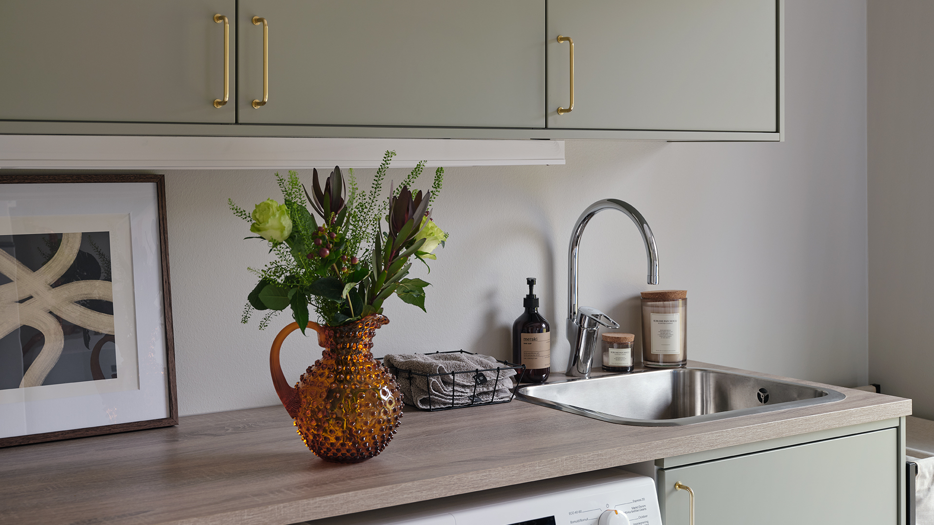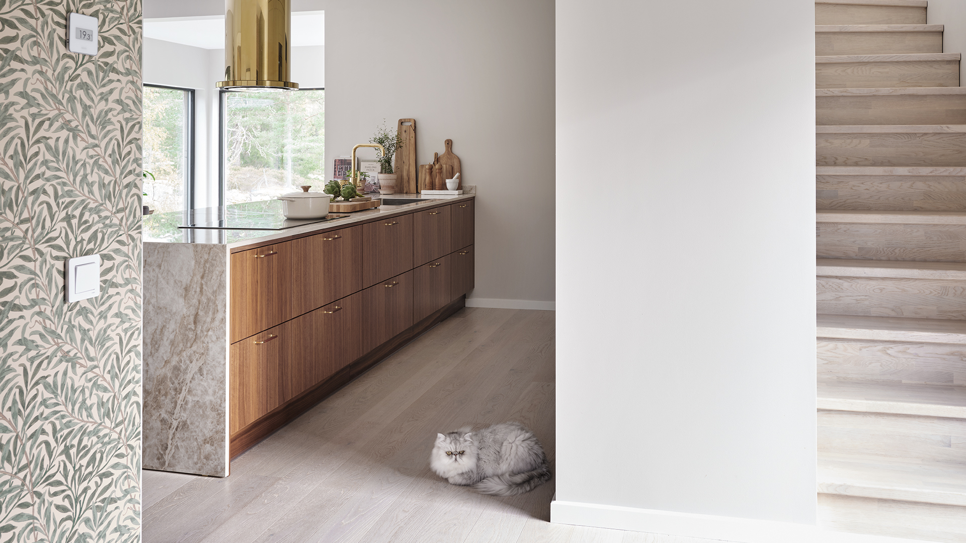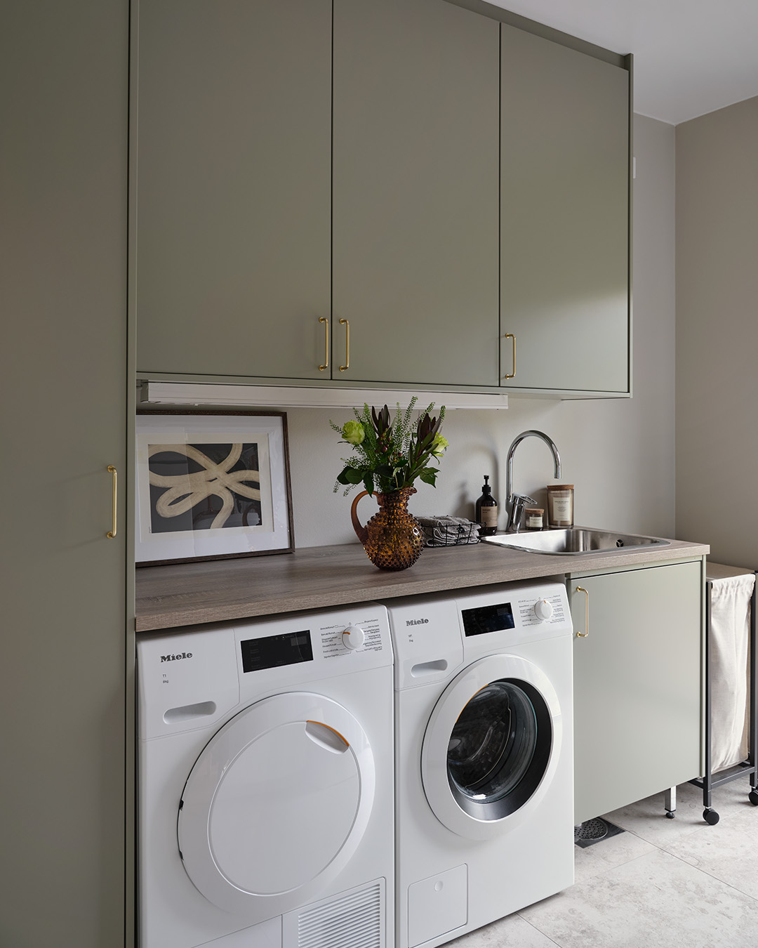 Under hela processen har det också varit viktigt att skapa en närhet mellan inne och ute, och sudda ut den gränsen. Omgivningen har haft stor inverkan på materialvalen och förutom köket i valnöt och sandbeige så har paret valt kulören dimgrön på sin Veduminredning i både hall och tvättstuga. En harmonisk kulör med inspiration från naturen.