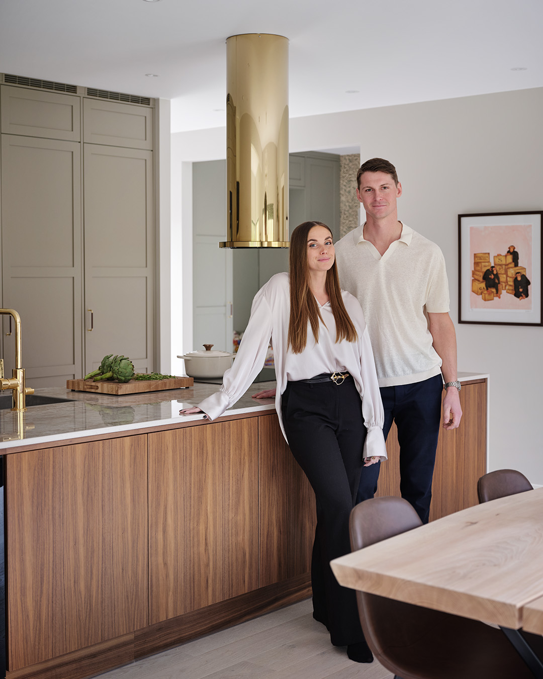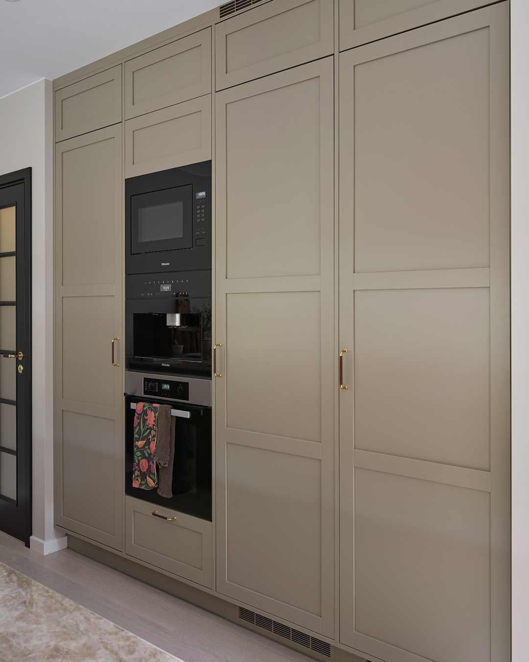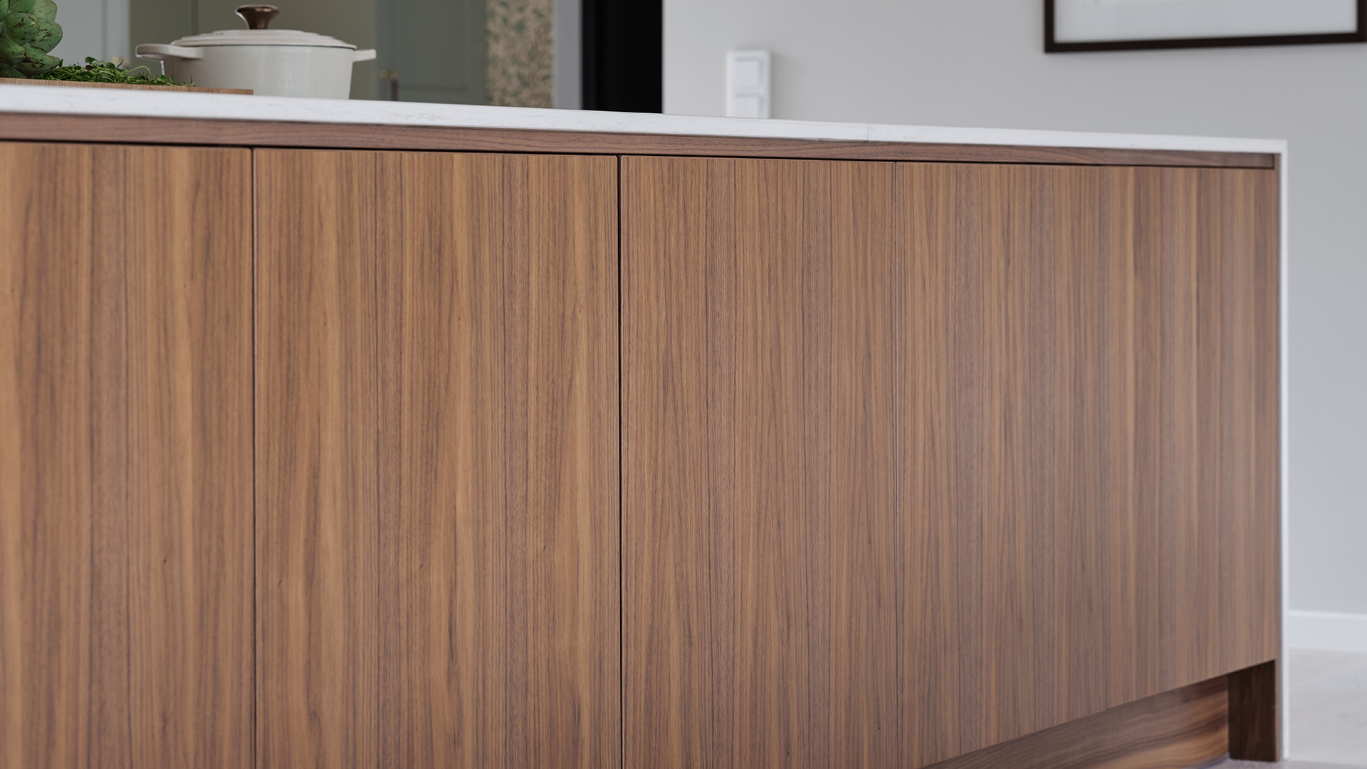 Under hela processen har det också varit viktigt att skapa en närhet mellan inne och ute, och sudda ut den gränsen. Omgivningen har haft stor inverkan på materialvalen och förutom köket i valnöt och sandbeige så har paret valt kulören dimgrön på sin Veduminredning i både hall och tvättstuga. En harmonisk kulör med inspiration från naturen.