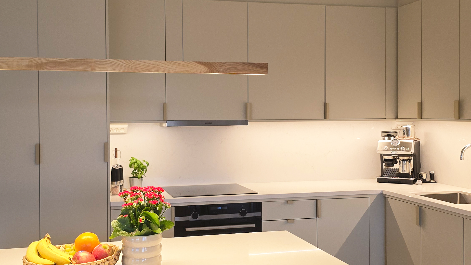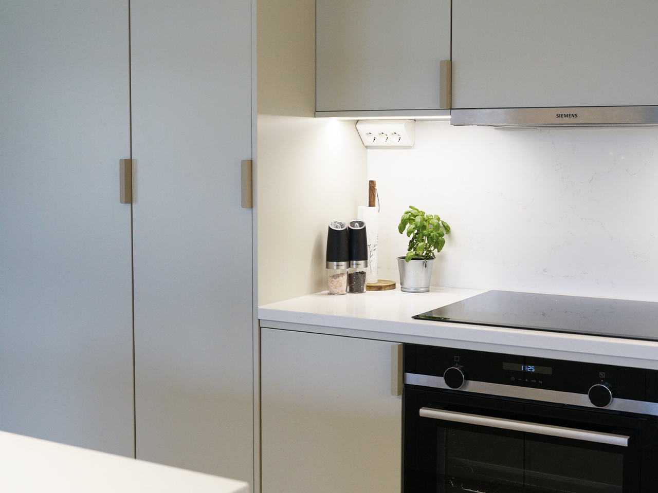 Emilia och hennes sambo har också lagt stor vikt vid att skapa ett funktionellt kök med smarta lösningar som gör det lätt att arbeta där. En särskild lösning de är mycket nöjda med är den infrästa ledbelysningen under överskåpen. Belysningen ger ett jämnt och behagligt ljus som sprider sig över hela arbetsytan och gör det lättare att arbeta i köket, samtidigt som det skapar en mysig atmosfär.