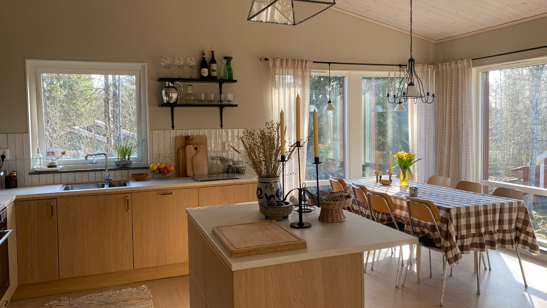 Huset, som byggdes under 2023/2024, har en öppen planlösning mellan kök och vardagsrum. Detta ställde särskilda krav på designen, eftersom Clara ville att köket skulle smälta in i resten av rummet.