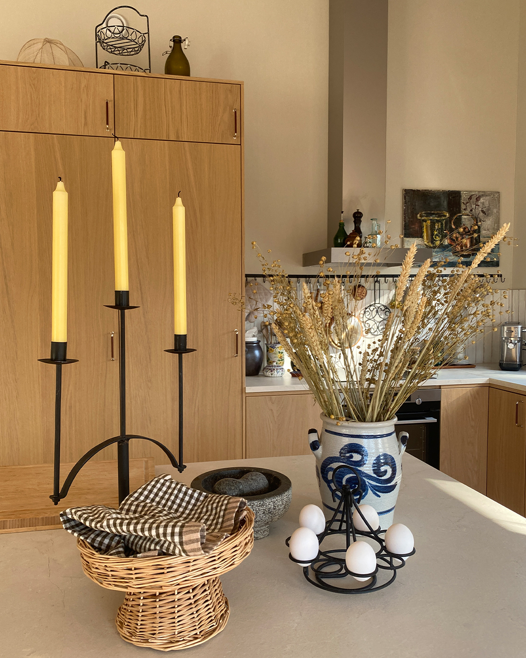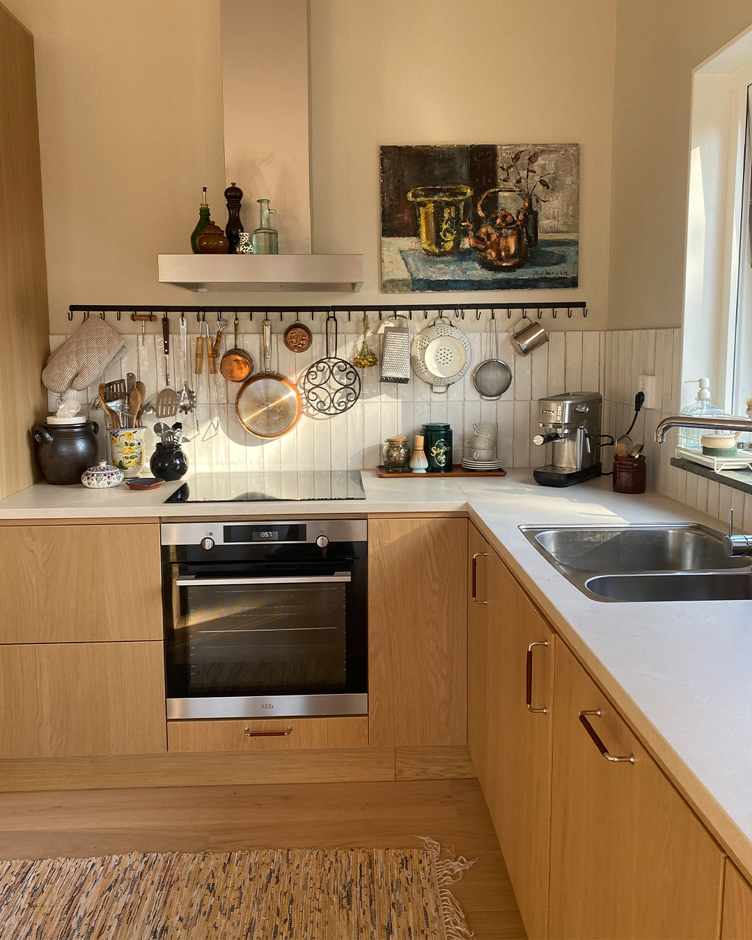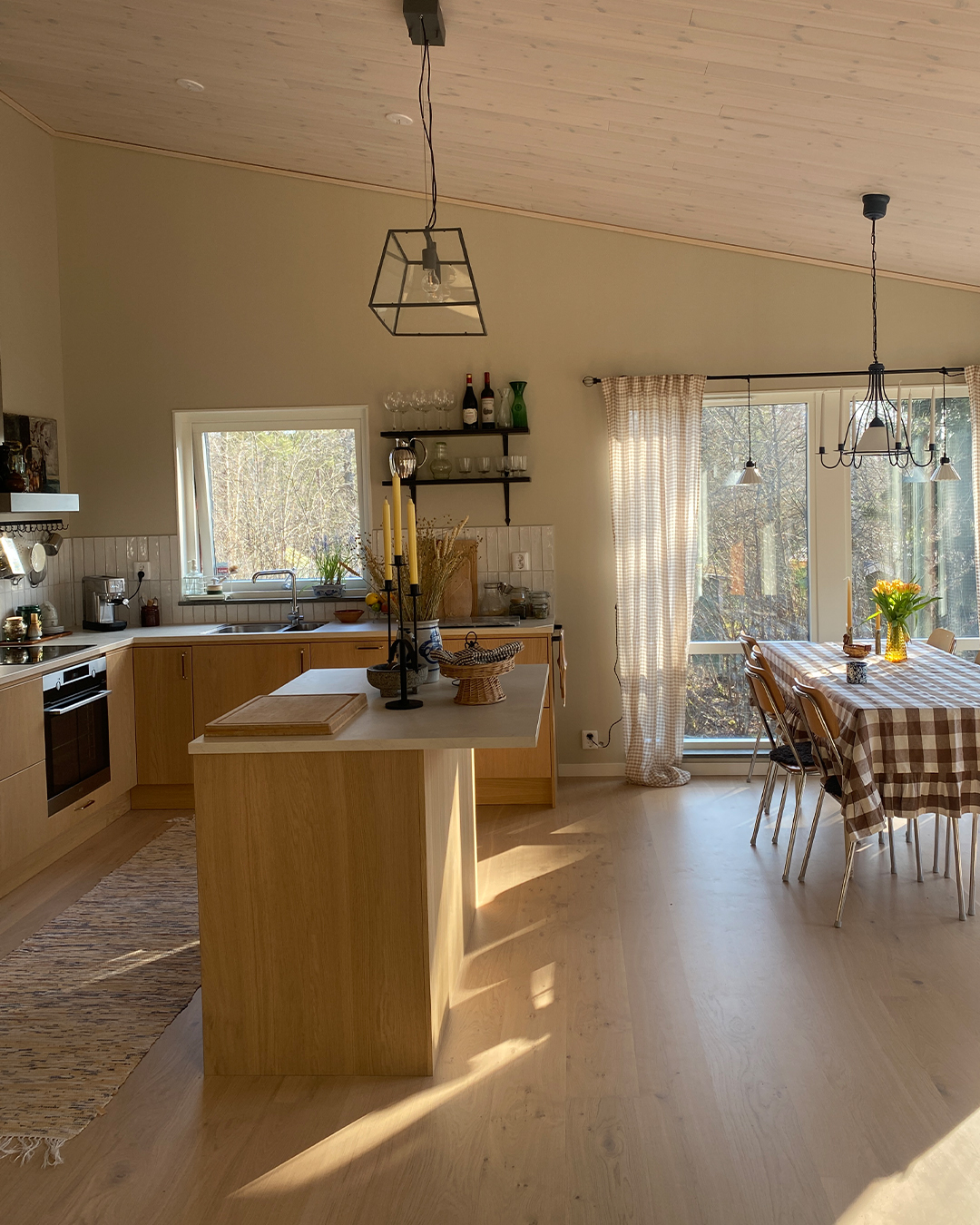 - Eftersom vi har öppen planlösning mellan kök och vardagsrum var det viktigt att köket inte skulle kännas för 'köksigt' och sticka ut för mycket, förklarar Clara. För att uppnå detta valde hon att tapetsera väggarna i rummet med en tapet som hade linnetextur och kombinerade detta med ljusa trägolv för att skapa en varm, inbjudande atmosfär.