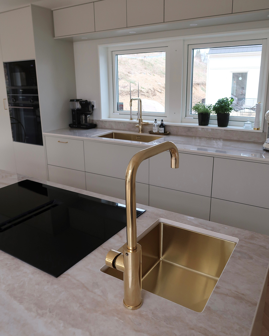 Inför renoveringen var det även viktigt att tvättstugan skulle gå i samma toner som köket, för att binda ihop hemmet på ett bättre sätt än tidigare då tvättstuga var vit. Därför valde de luckan Maja i kulören linnebeige även här, något de inte ångrar.