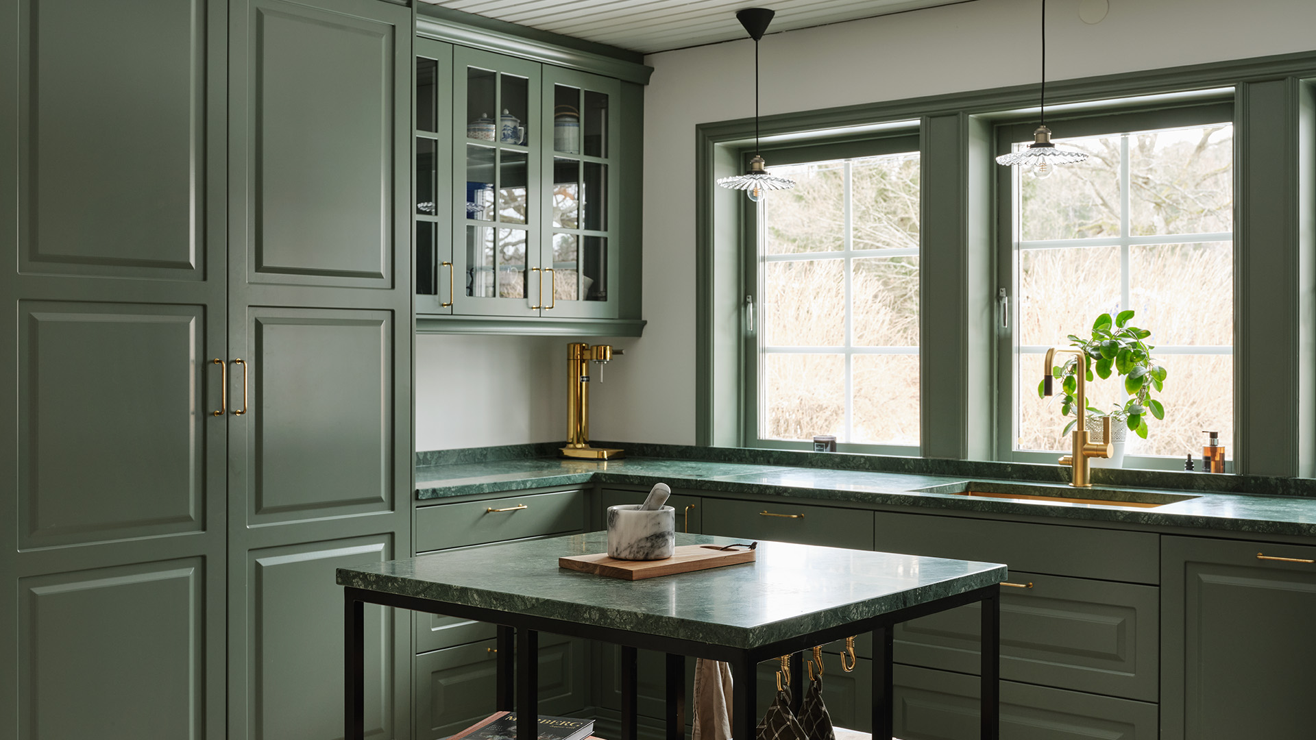 Ingen minns en fegis! Att våga kombinera en skogsgrön lucka med en grön bänkskiva i natursten är ett av Lotta Möller och sambon Viktor Mickelssons bästa köksbeslut. Den gröna kulören ger köket precis den varma och härliga känsla de ville ha.