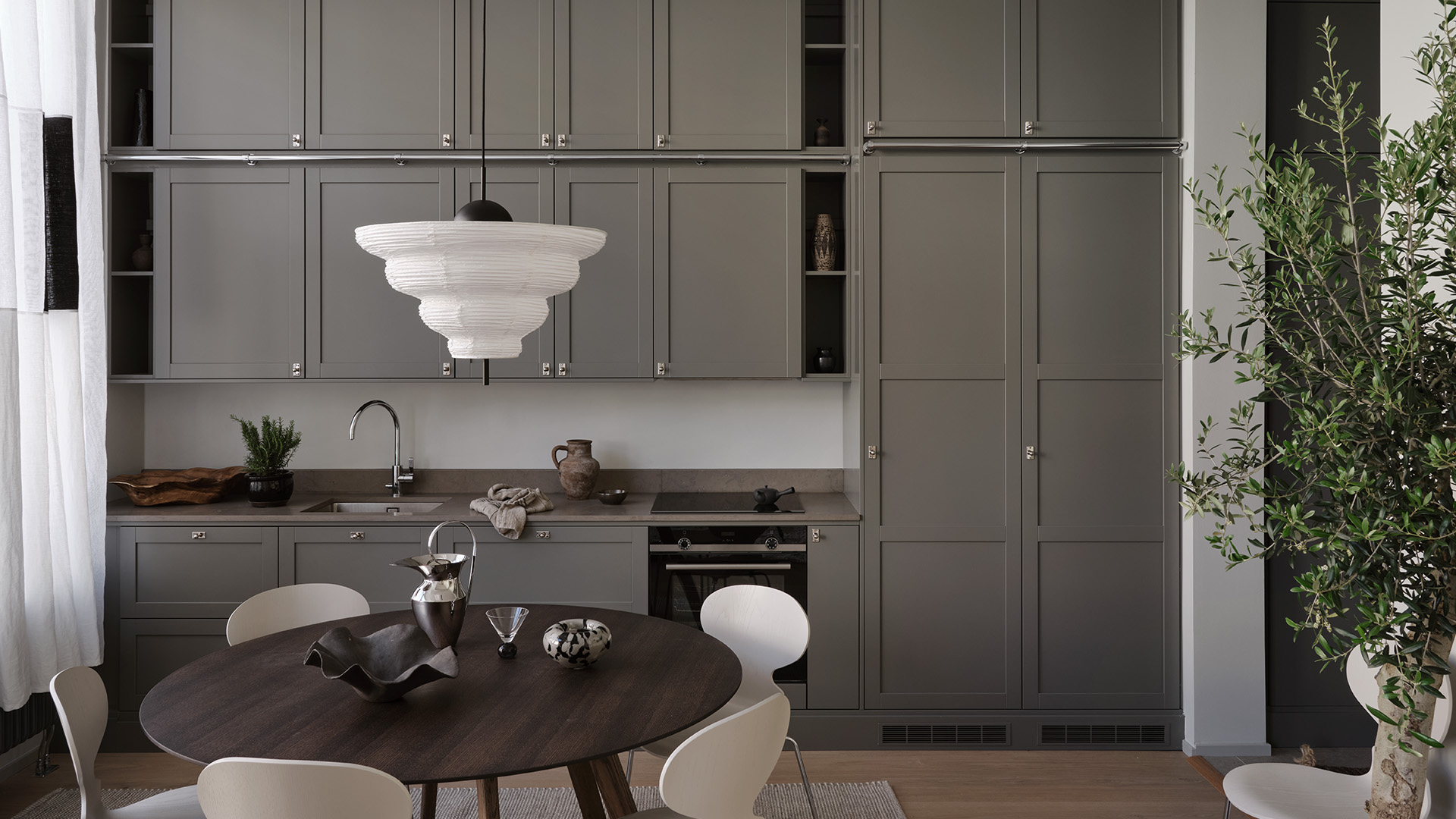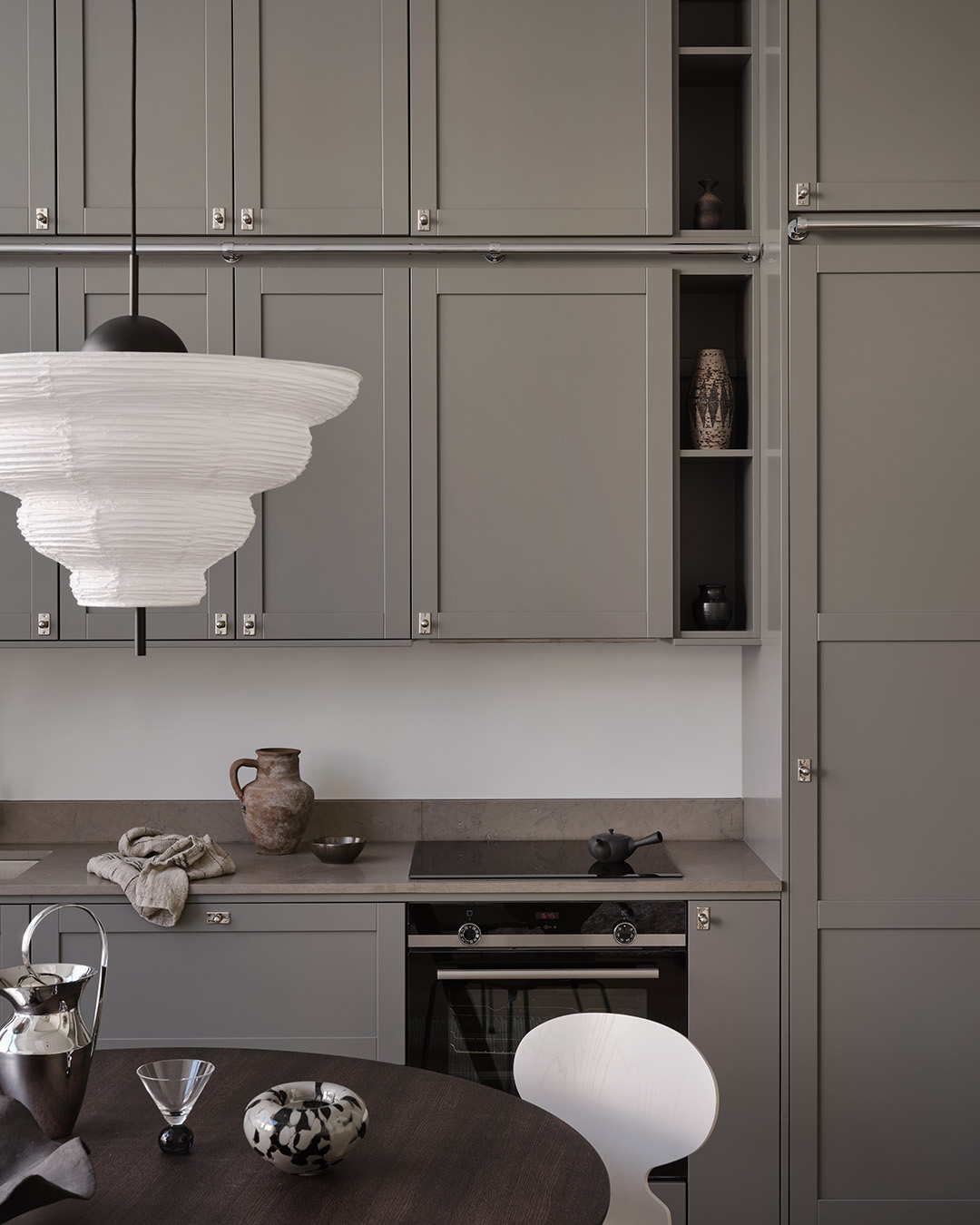 Vedums betonggrå kulör återfinns på inredningen i kök, badrum och hall medan den något ljusare kulören varmgrå har valts till de båda sovrummen. Att kombinera två grå kulörer skapar en dynamisk, men samtidigt harmonisk helhet i hemmet. Detta förstärks ytterligare av att de klassiska ramluckorna Edit och Thea får sällskap av den något mer moderna luckan Maja.
