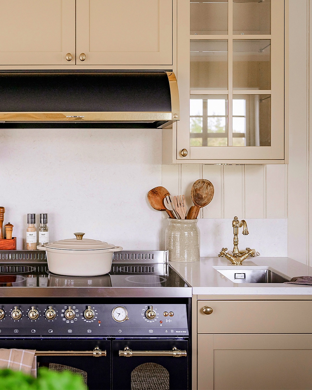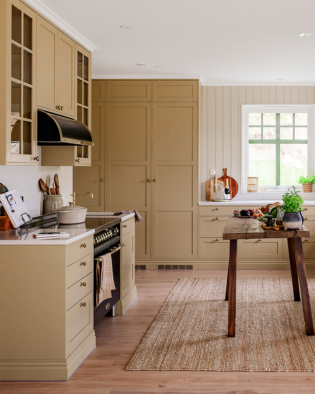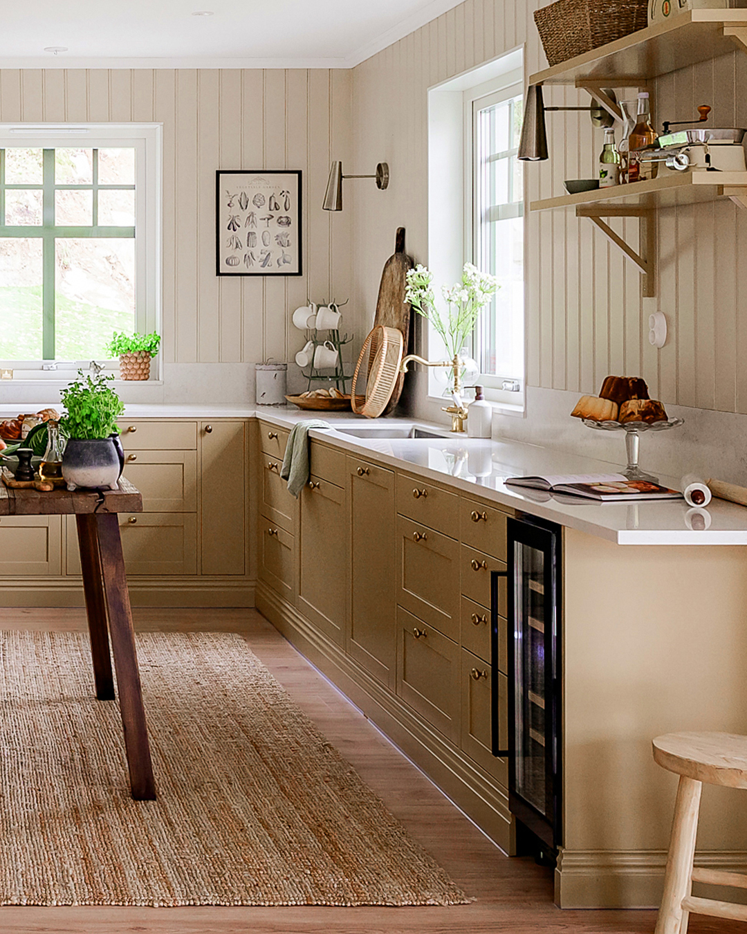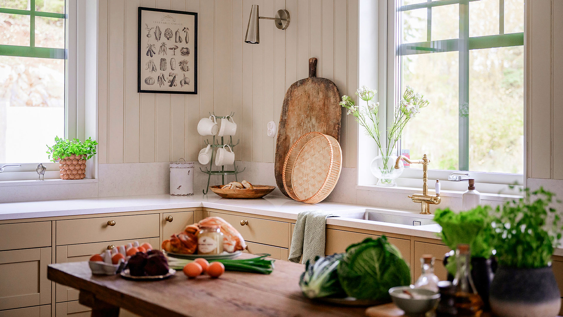 I Sätesgården har det lantliga köket fått stå i centrum. Med gula toner, pärlspont och antikmässing har Sandra Boart från Studiosextioett skapat ett hem fullt av värme och personlighet.