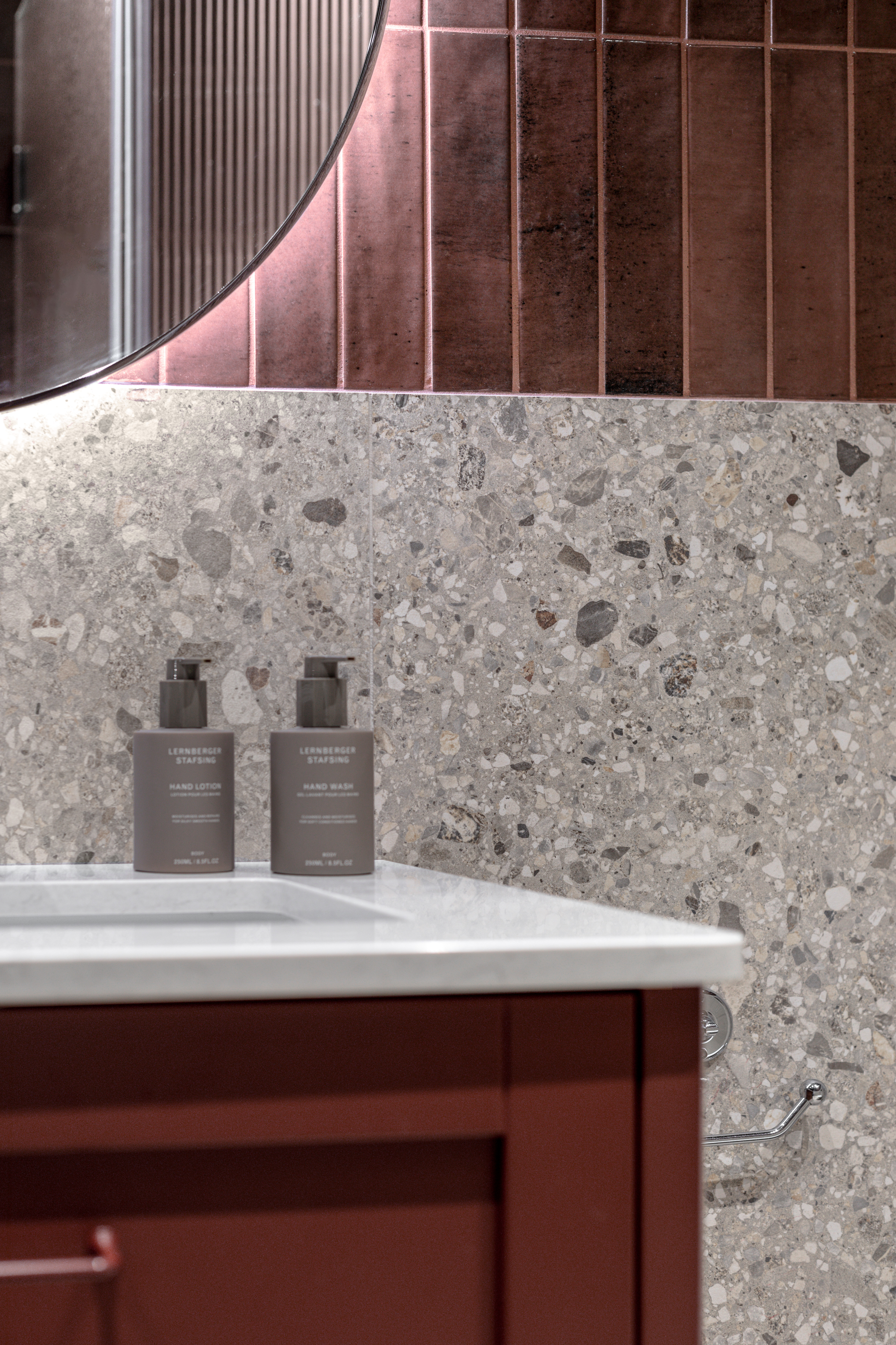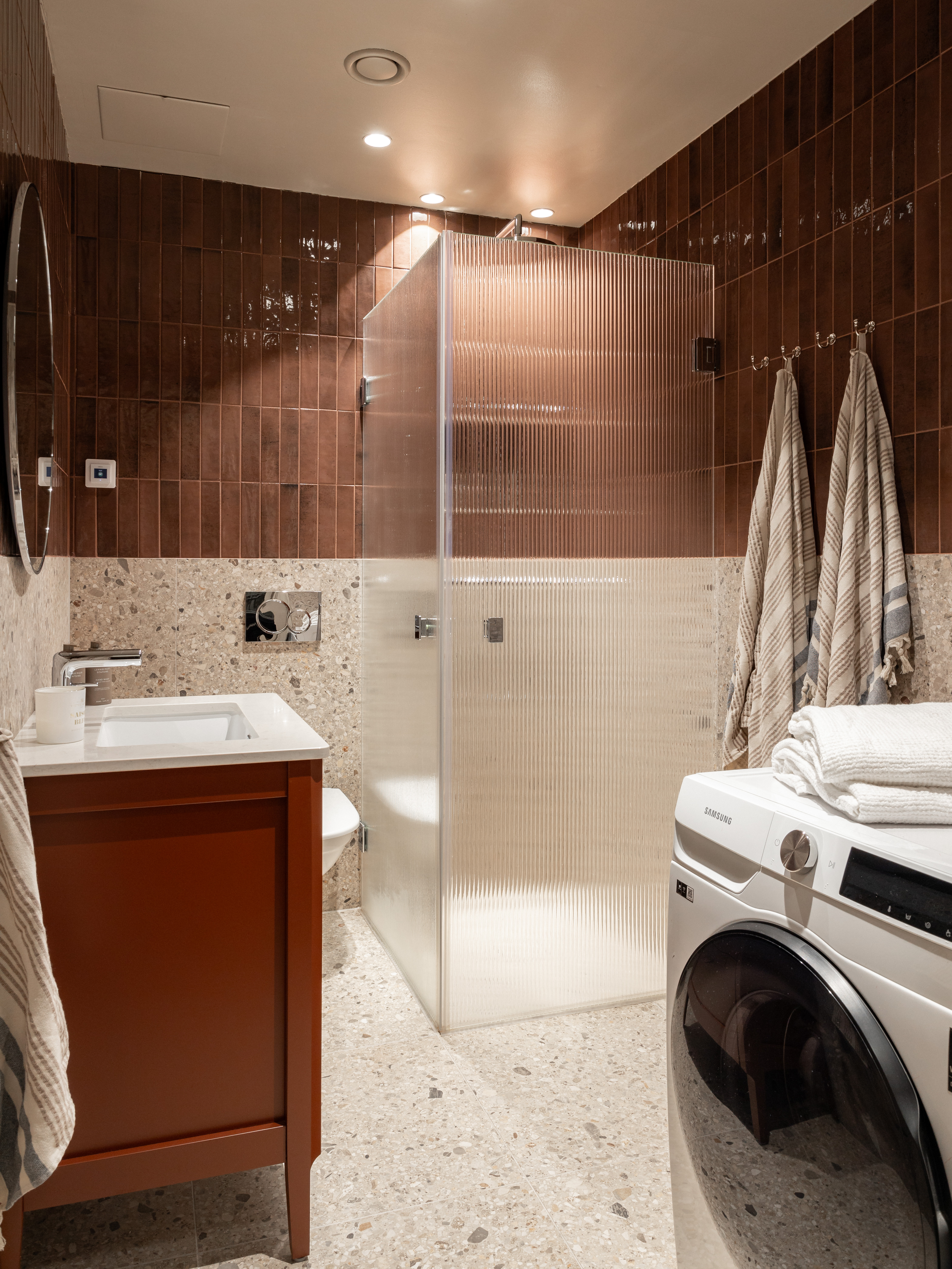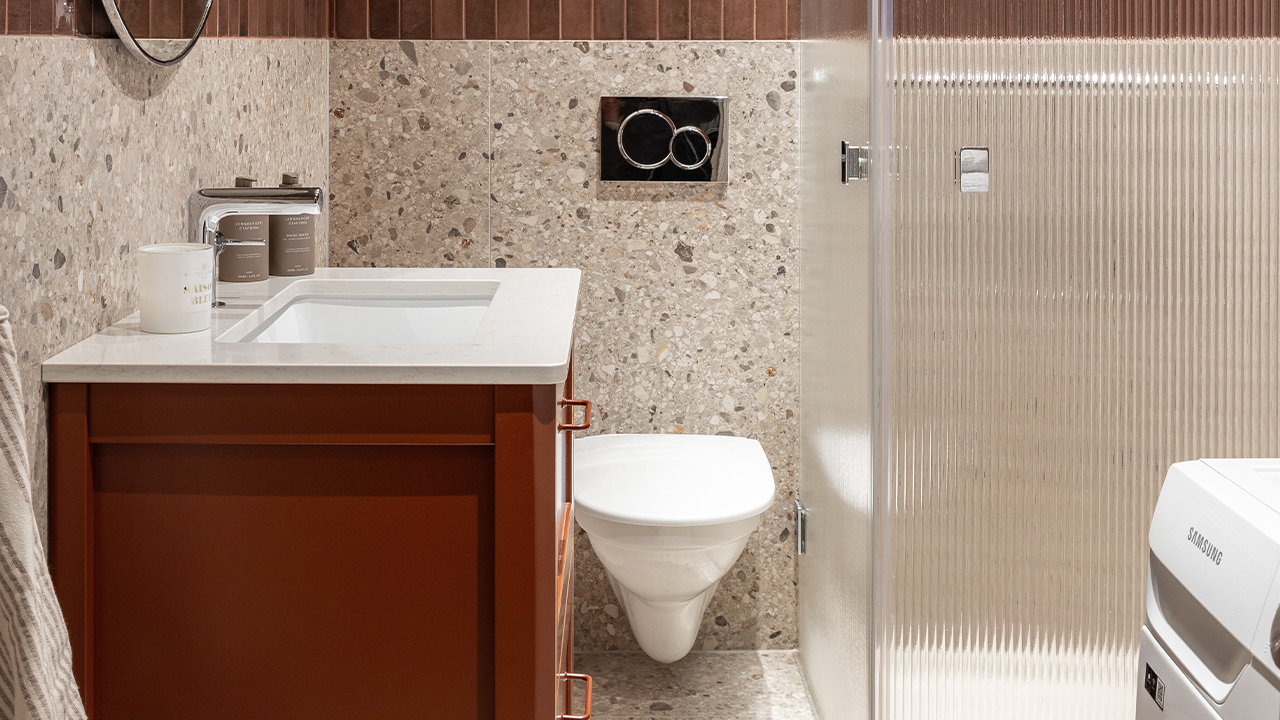 Resultatet? Ett badrum som blev precis som de hade tänkt sig. Sofie och hennes familj älskar sin nya oas, som blandar klassiska material med en modern twist. Kombinationen av terrazzogolv, kakel, och en kommod med topplatta av sten ger rummet både ett stilfullt och jordnära uttryck.