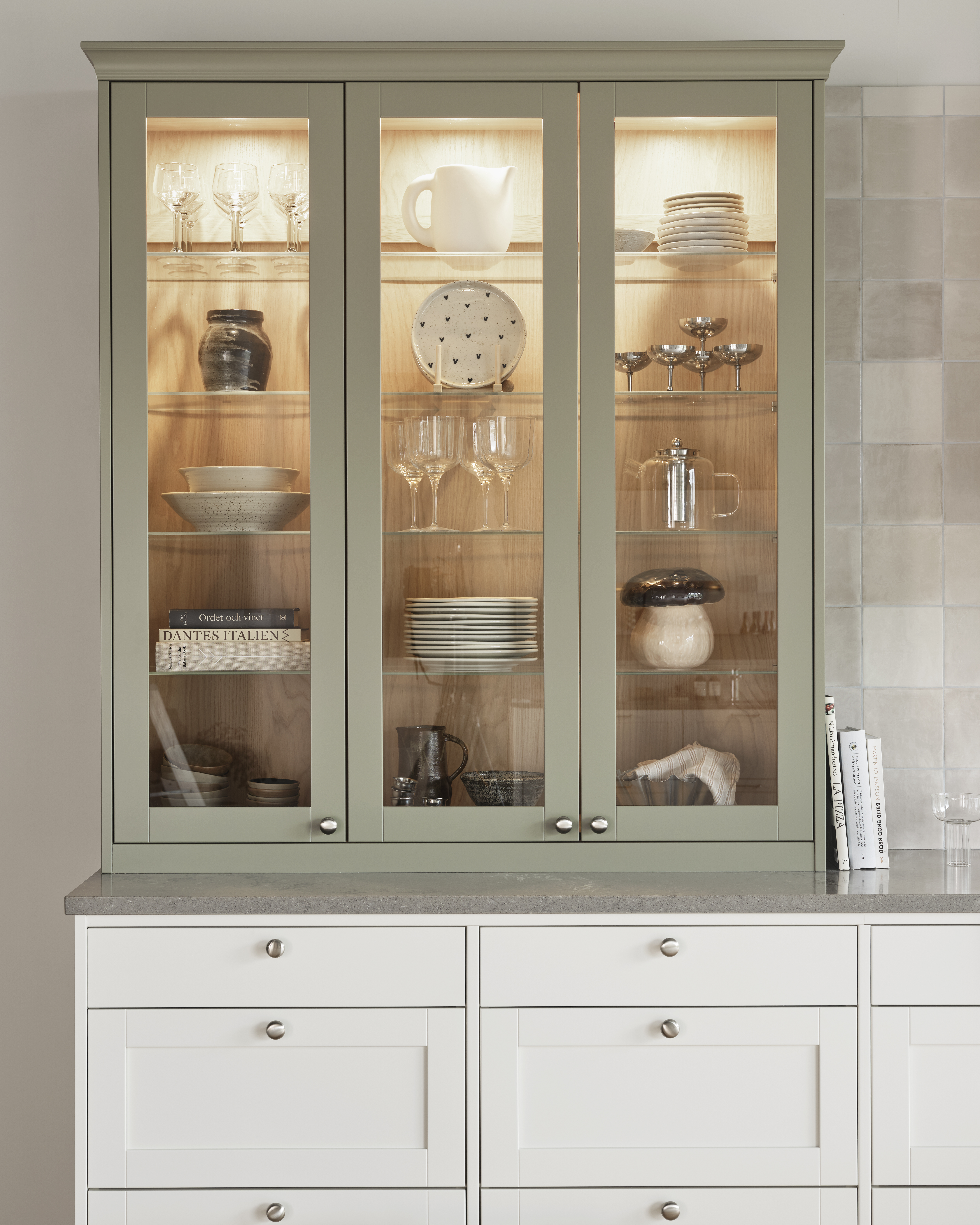 Vitrinlucka i dimgrönt med insida i ek vilket ger en varm fond för saker du vill visa upp.