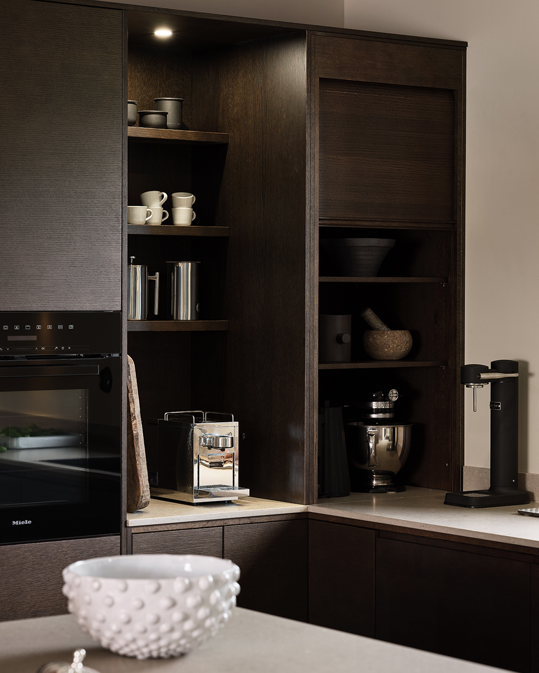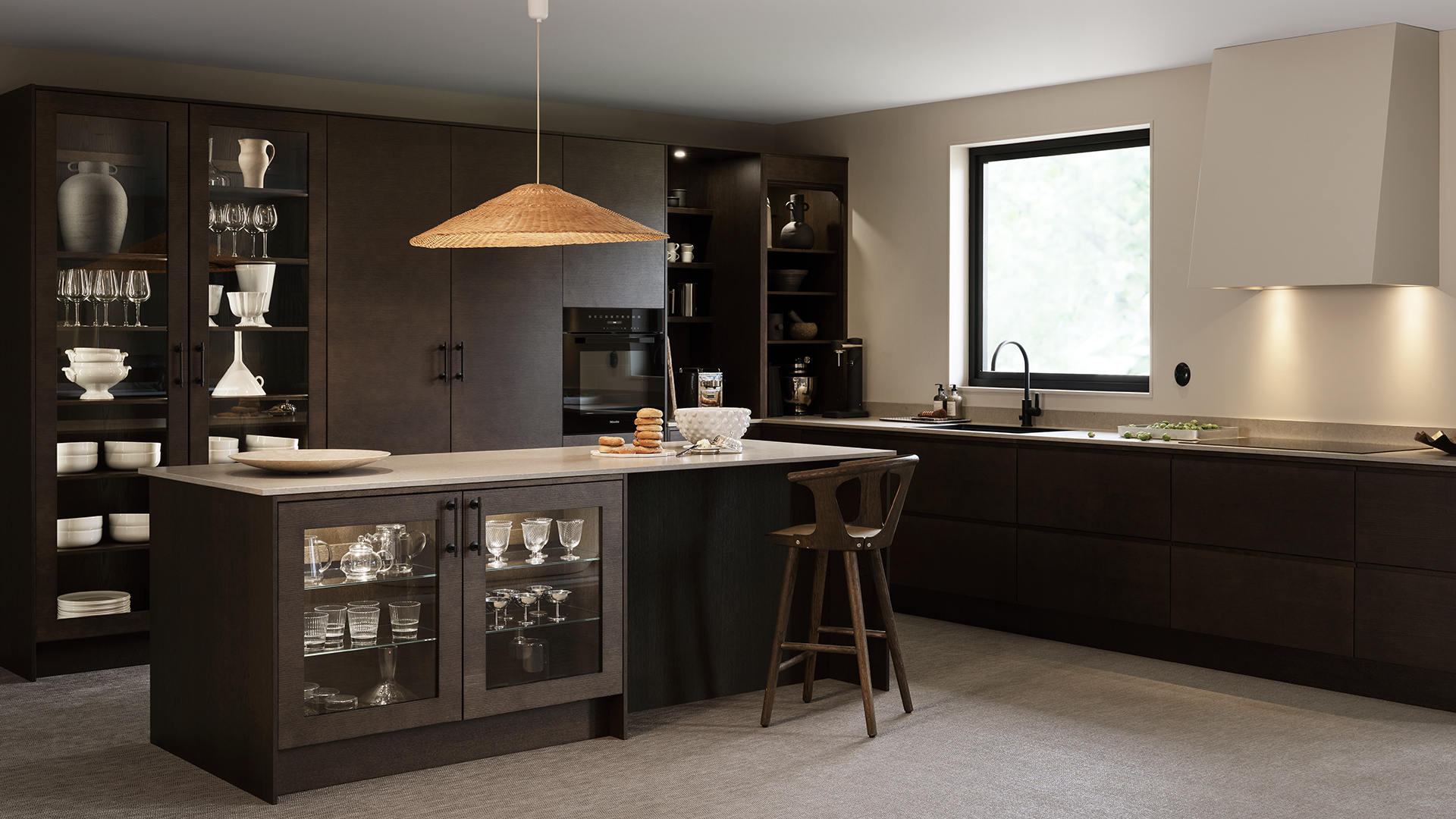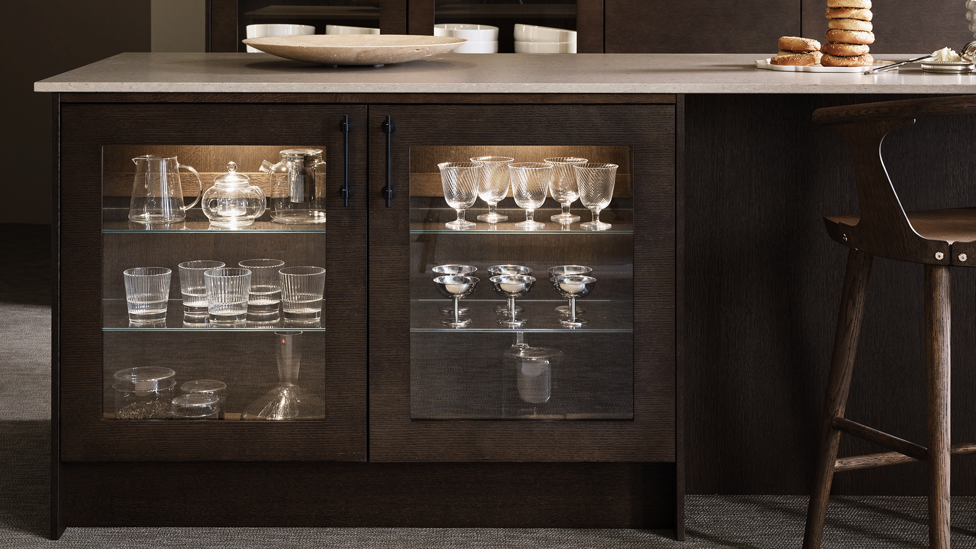 Ett sobert kök med luckan Liv i det nya utförandet brun ek som skapar en exklusiv känsla. De nya vitrinskåpen, jalusiskåpet och det skräddarsydda utrymmet för kaffemaskinen gör att du kan välja synligt och lättillgängligt eller undangömt och prydligt.