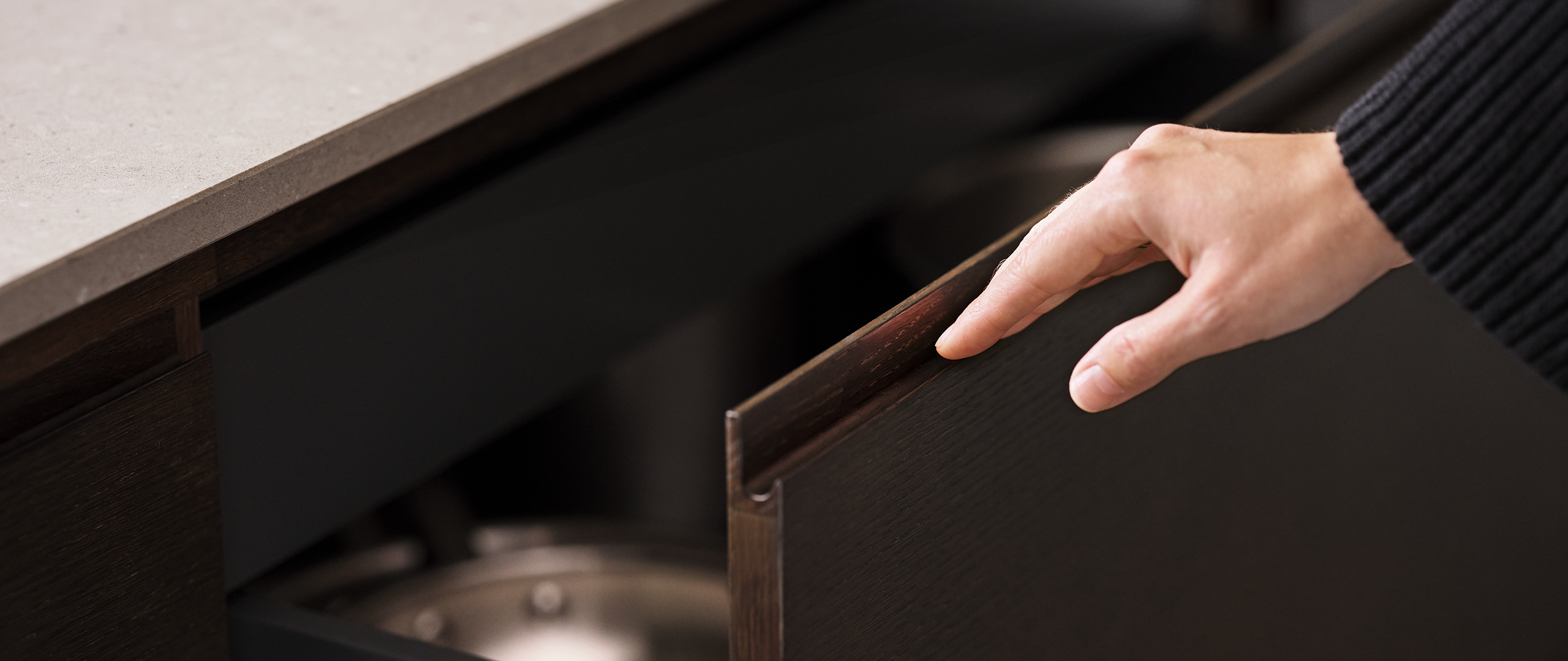Luckan Liv i det nya utförandet brun ek som är inspirerad av naturen och skapar en taktil träkänsla. Till luckan kan du välja integrerad grepplist i samma träslag som luckan som ger en exklusiv känsla.