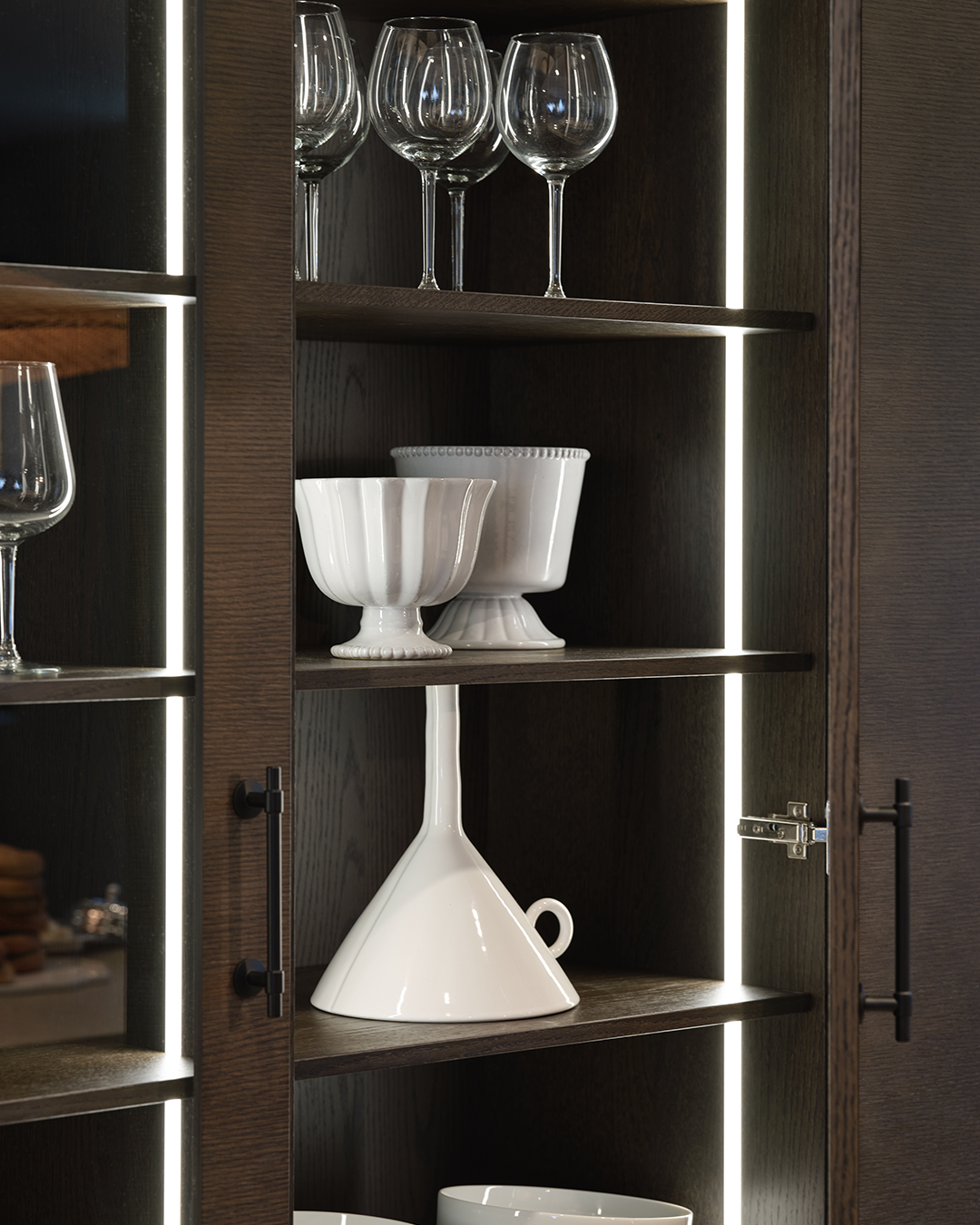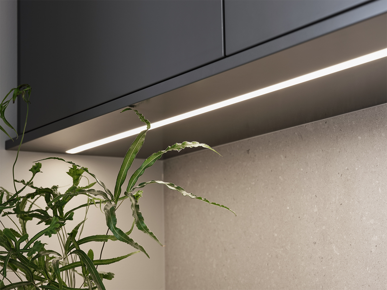 Belysningen Long lyser upp insidan av skåpet och ger ett djup till köket.