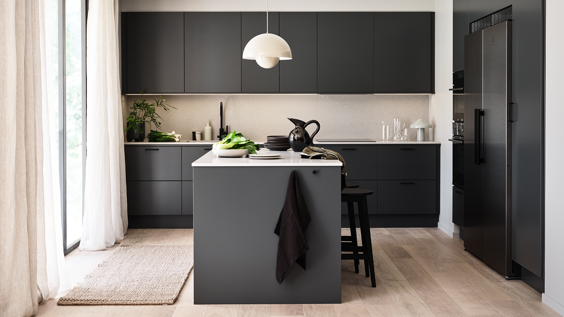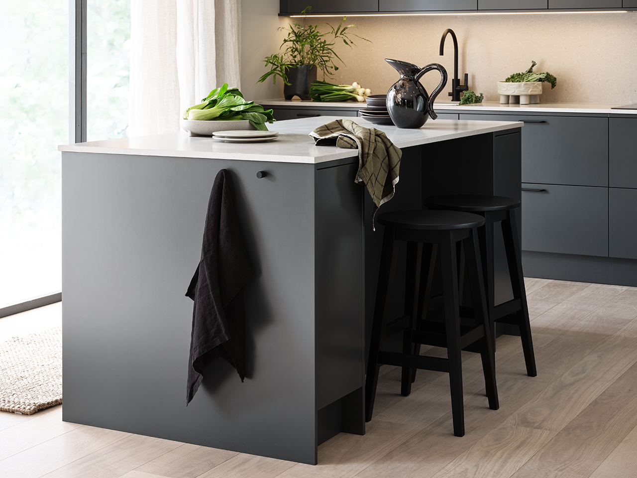 Japandi är inredningsstilen som återkommer i fler svenska hem. Stilen förenar funktionell, skandinavisk design med japansk minimalism och känns igen av raka linjer, naturnära material och minimalism. Det här har vi tagit fasta på i vår nya sobra köksmiljö med den släta luckan Maja mörkgrå.