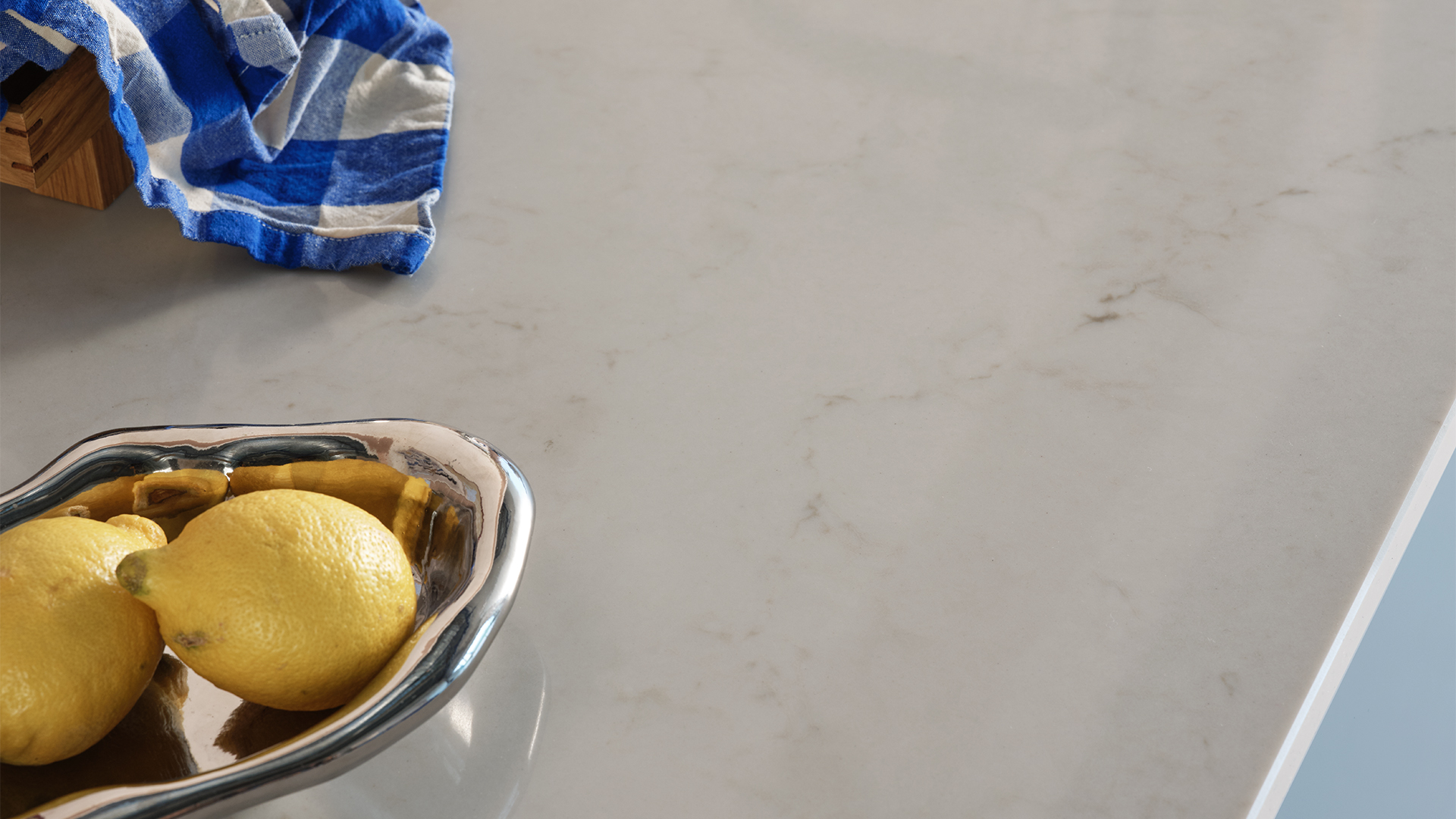 På köksbänken och köksön breder den beige kompositstenen Wyndigo ut sig, ett material känt för sina tåliga och slitstarka egenskaper.