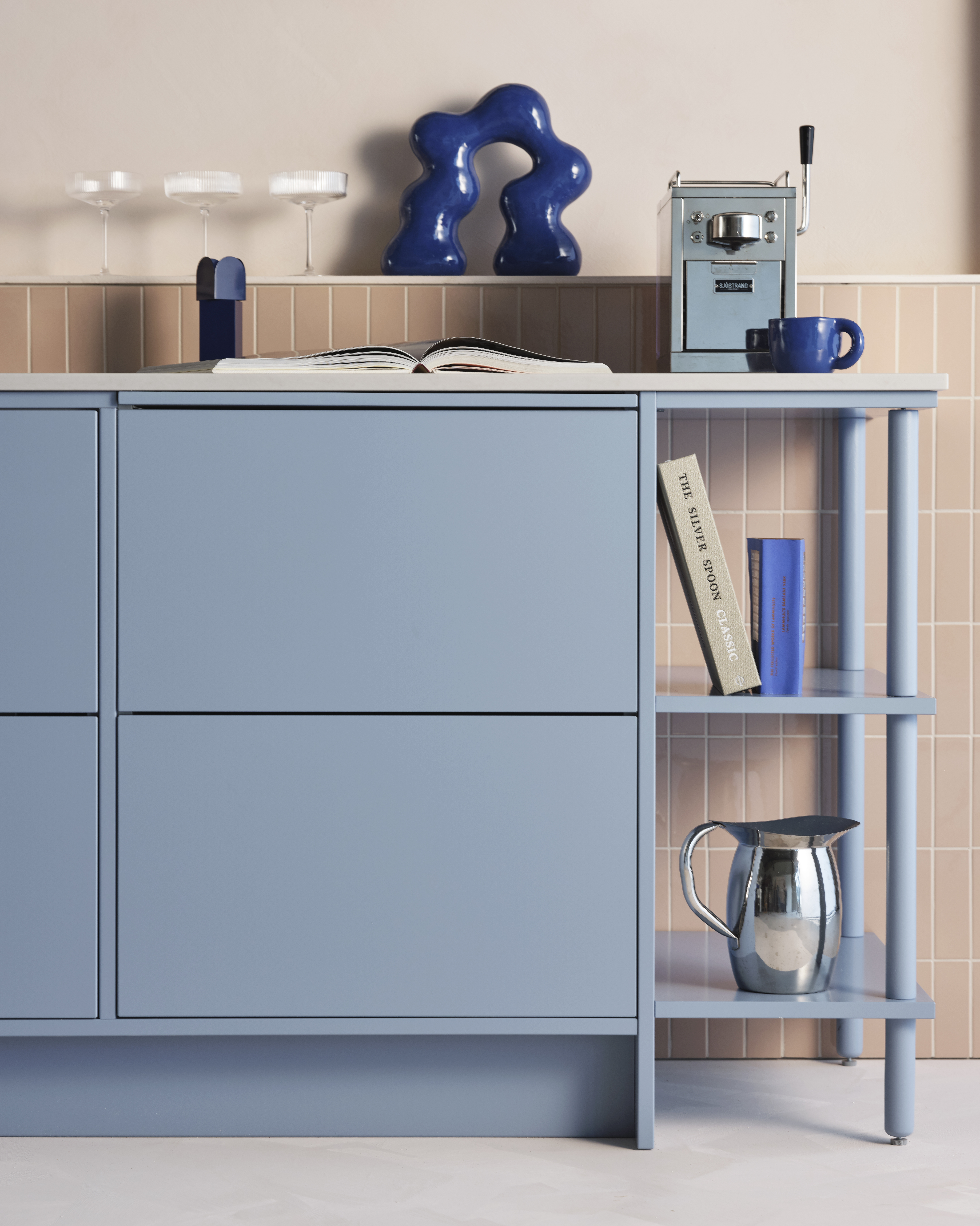 Duon har tagit fasta på det lekfulla och flörtiga för att ge den moderna stilen en lite mer mjuk och lättsam ton. Den djärva blå kulören och det milda, mättade persikofärgade kaklet är båda starka personligheter som gifter sig fint i en balanserad, harmonisk övergång. Den rundade formen i valvet ger ett vänligt och välkomnande intryck, ramar in miljön och bildar också en vacker display-yta för personliga föremål. Ett modernt kök som känns varmt och avslappnat.