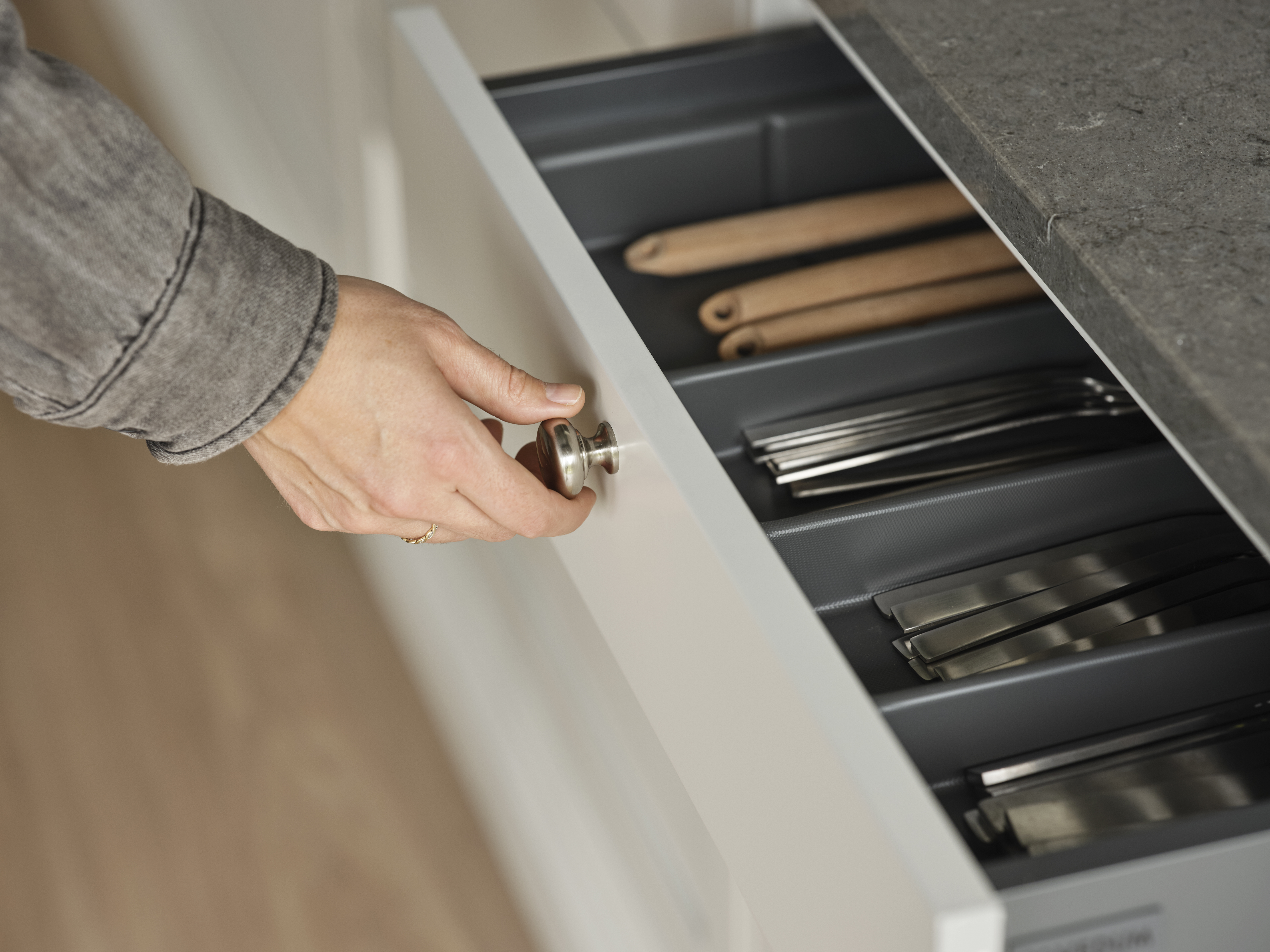 – Vi har tolkat Vedums klassiska stilkoncept på ett modernt och lekfullt sätt. Vi vill visa att man kan tänka lite annorlunda och ändå få ett kök som andas tradition, utan att det ska kännas för lantligt eller romantiskt. I köksmiljön valde vi till exempel bort överskåp och ersatte med ett dimgrönt vitrinskåp. I kontrast mot de mjuka naturvita luckorna, det glansiga kaklet och ljusa ekgolvet skapas en subtil men spännande kontrast.