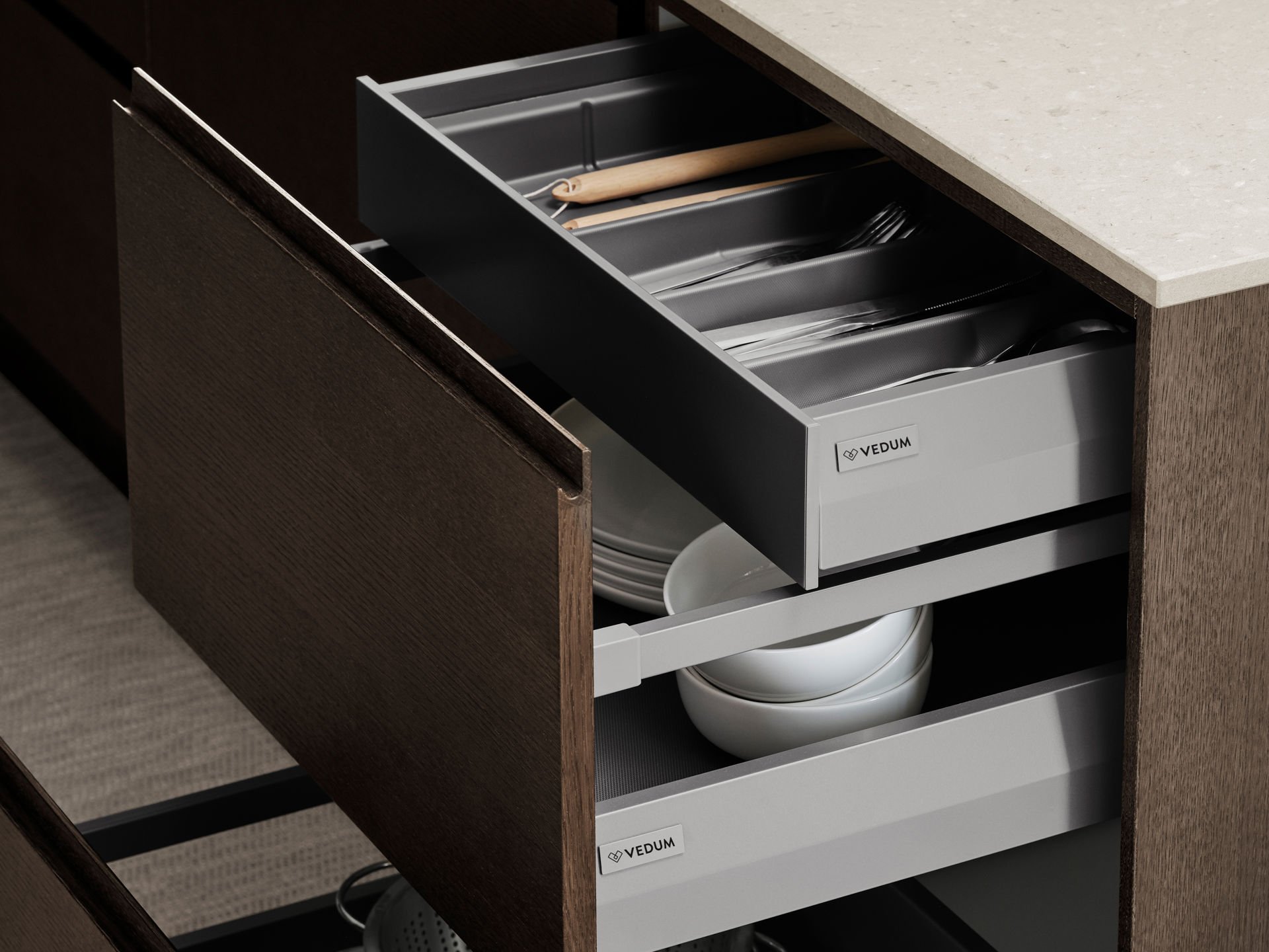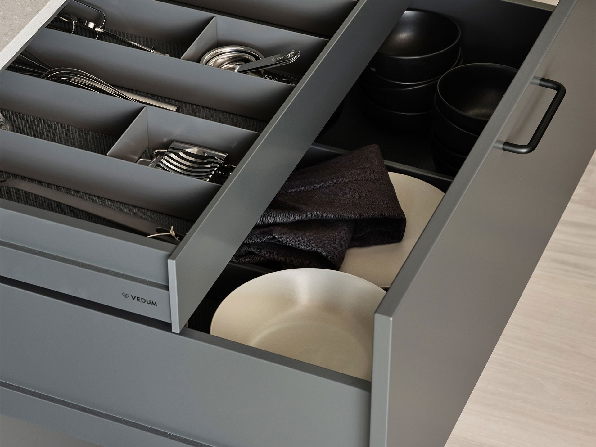 Vedums invändiga lådor och inredning i lådor hjälper dig att förvara bestick, köksredskap och annan utrustning på ett praktiskt sätt. Kontrollera noga vilken typ av låda du har så du får inredning som passar i just ditt kök.