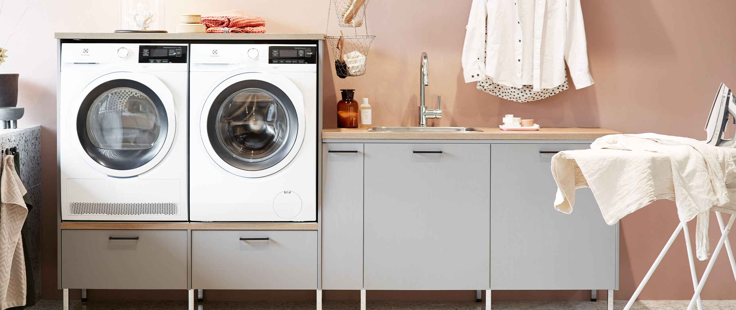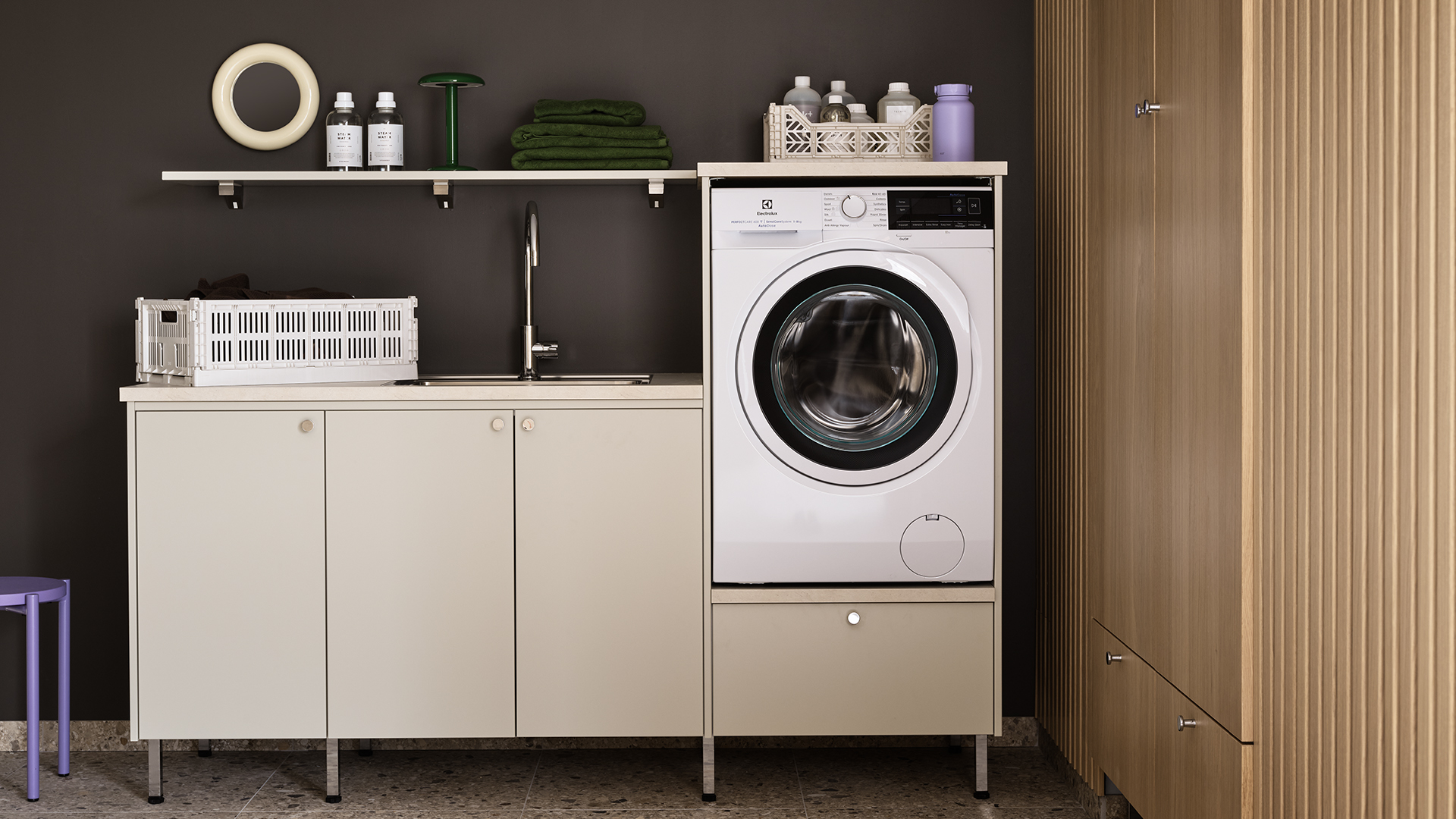 En tvättstuga i naturnära toner, varm träkänsla och en materialblandning som skapar dynamik. Tvättstugan har massor av smarta lösningar som gör vardagen enklare, ett exempel är den nya funktionen med en trådhylla i lådan under tvättmaskinen. På det sättet kan du ha tvättkorgen på en bekväm höjd och får en ergonomiskt bra arbetsställning. Och så har vi dessutom gjort en förvaringsvägg i trä där det finns gott om utrymme för dina saker.