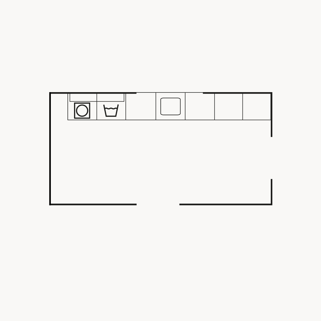 I den här tvättstugan har vi använt luckan Maja och skapat en funktionell lösning. Öppna hyllor för att enkelt komma åt det du använder ofta, och skåp för att dölja annat. Svarta detaljer som handtag och bänkskiva skapar ett distinkt uttryck.