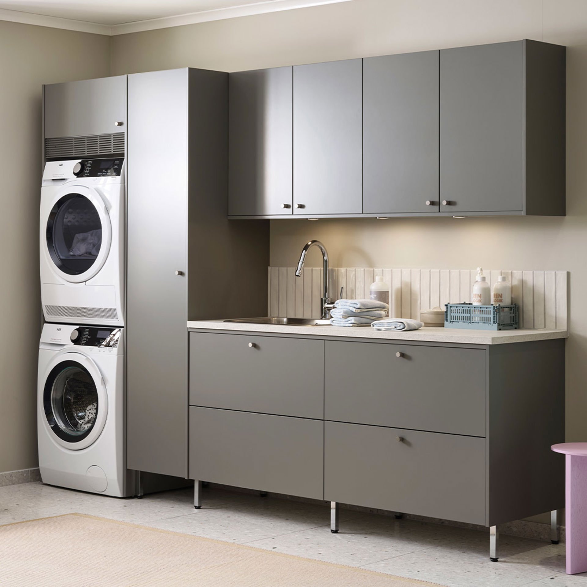 Här knyter vi an till en modern, internationell och innovativ designtradition. Tvättstugor med distinkta accenter, kvadratiska former, enkla strukturer och polerade ytor. För dig som vill ha minimala texturer, rena uttryck och en avskalad känsla.