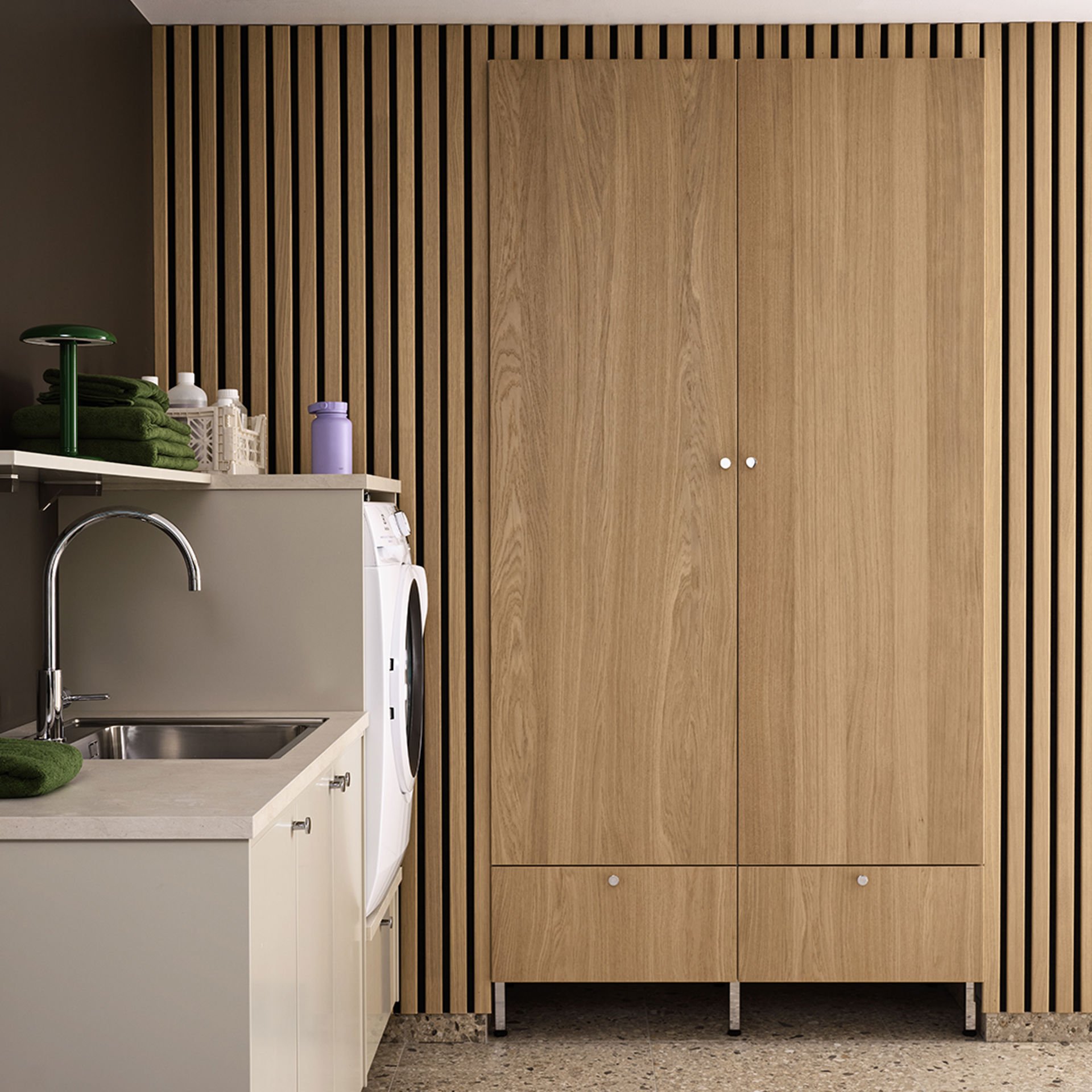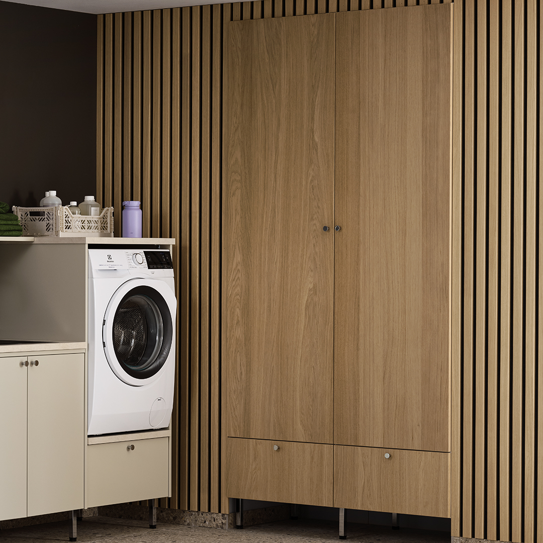 Ekfanerad lucka 20 mm spånskiva med svagt rundad träkant. Stående faner på lådfronter och luckor.